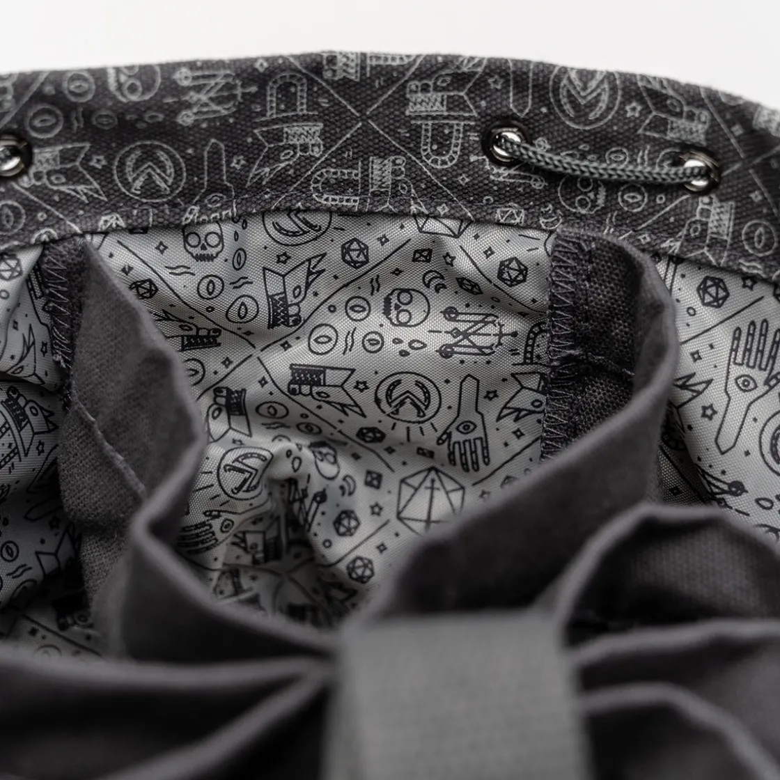 This version of Bailey’s Dice Bag of Hoarding features gray canvas with patterned icons inspired by the Vox Machina and Mighty Nein campaigns and black suede.