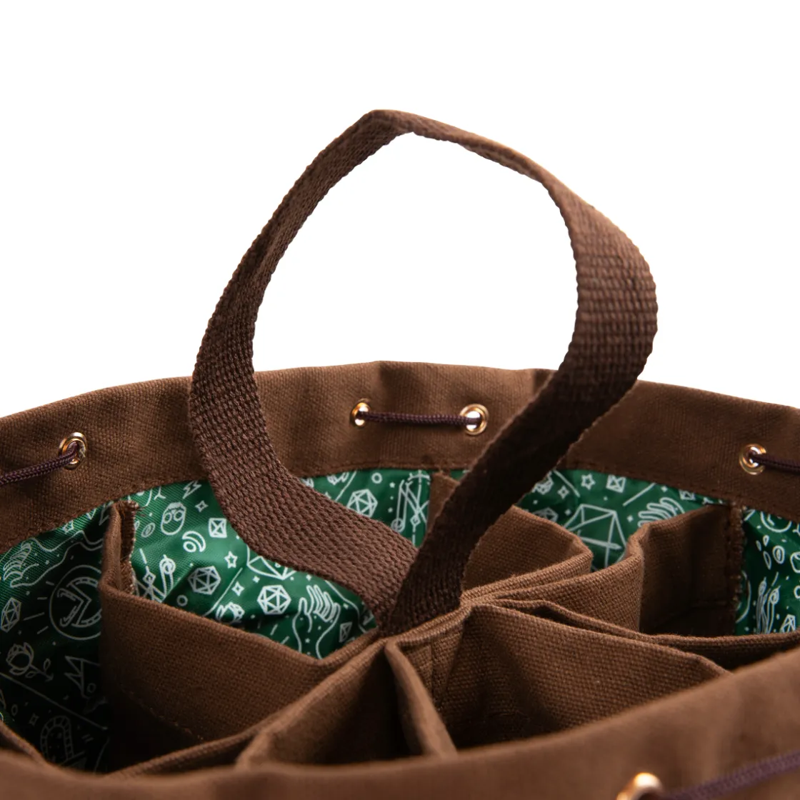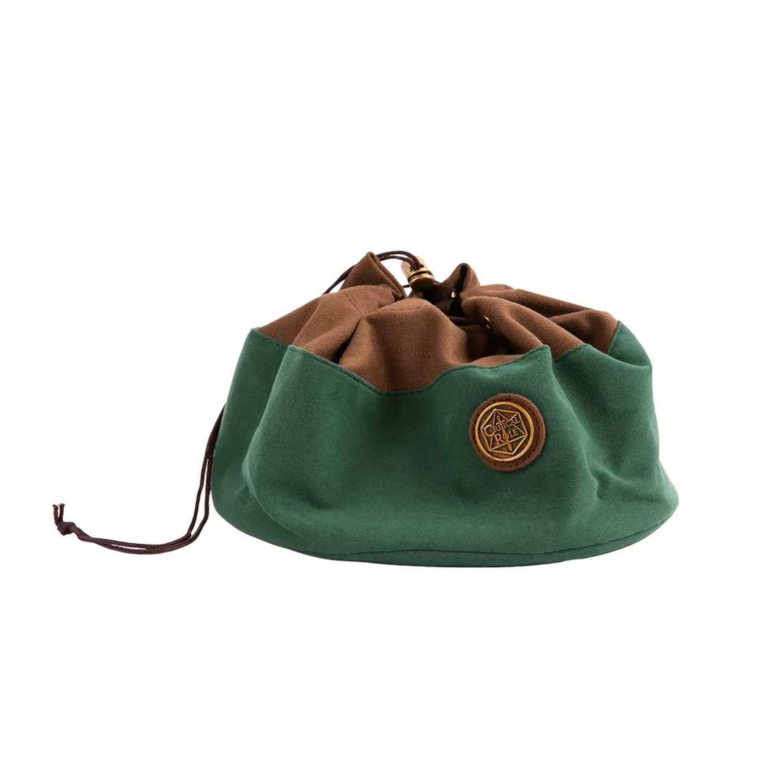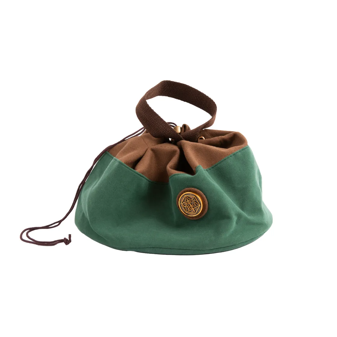 This version of Bailey’s Dice Bag of Hoarding features forest green polyurethane suede and brown canvas with patterned icons inspired by all three Critical Role campaigns on the inside.