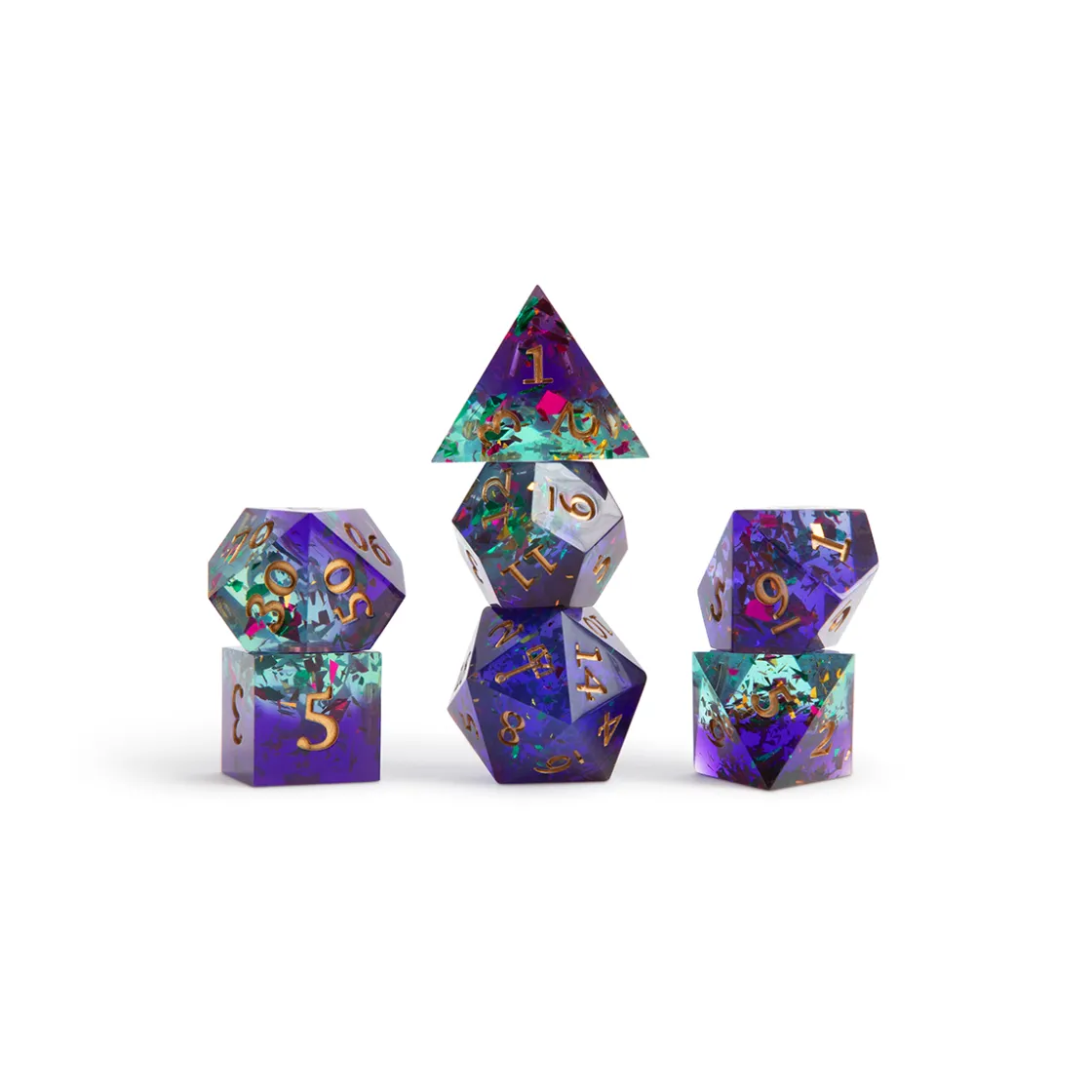 - Set of 7 sharp edged epoxy resin polyhedral dice including one of each of the following dice styles:
