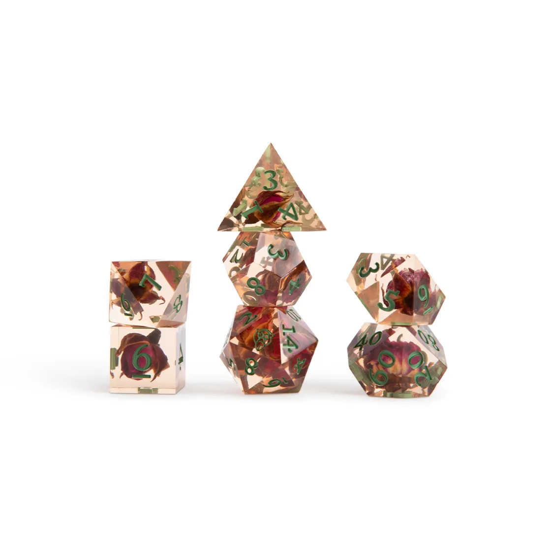 - Set of 7 sharp edged epoxy resin polyhedral dice including one of each of the following dice styles: