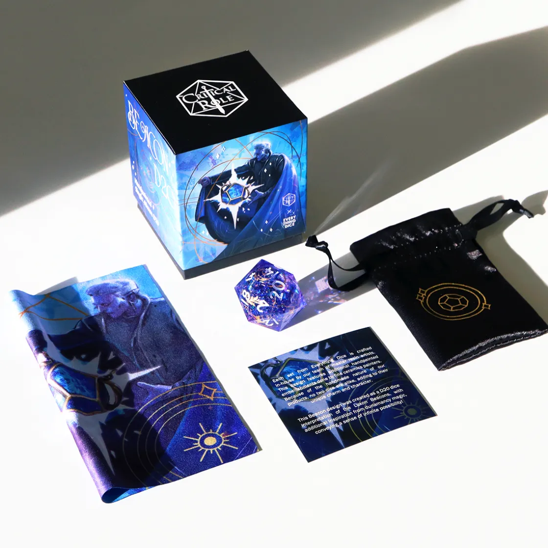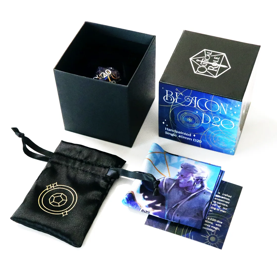The Luxon Beacon Oversized d20 also includes a microfiber polyester polishing cloth, a nylon bag with ribbon closure, as well as an insert describing the inspiration and recommendations for ensuring the quality of the die. The box artwork is a charming illustration of our resident hot boi Shadowhand, Essek Thelyss.