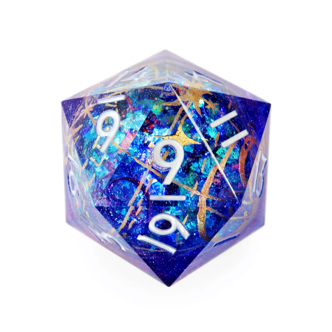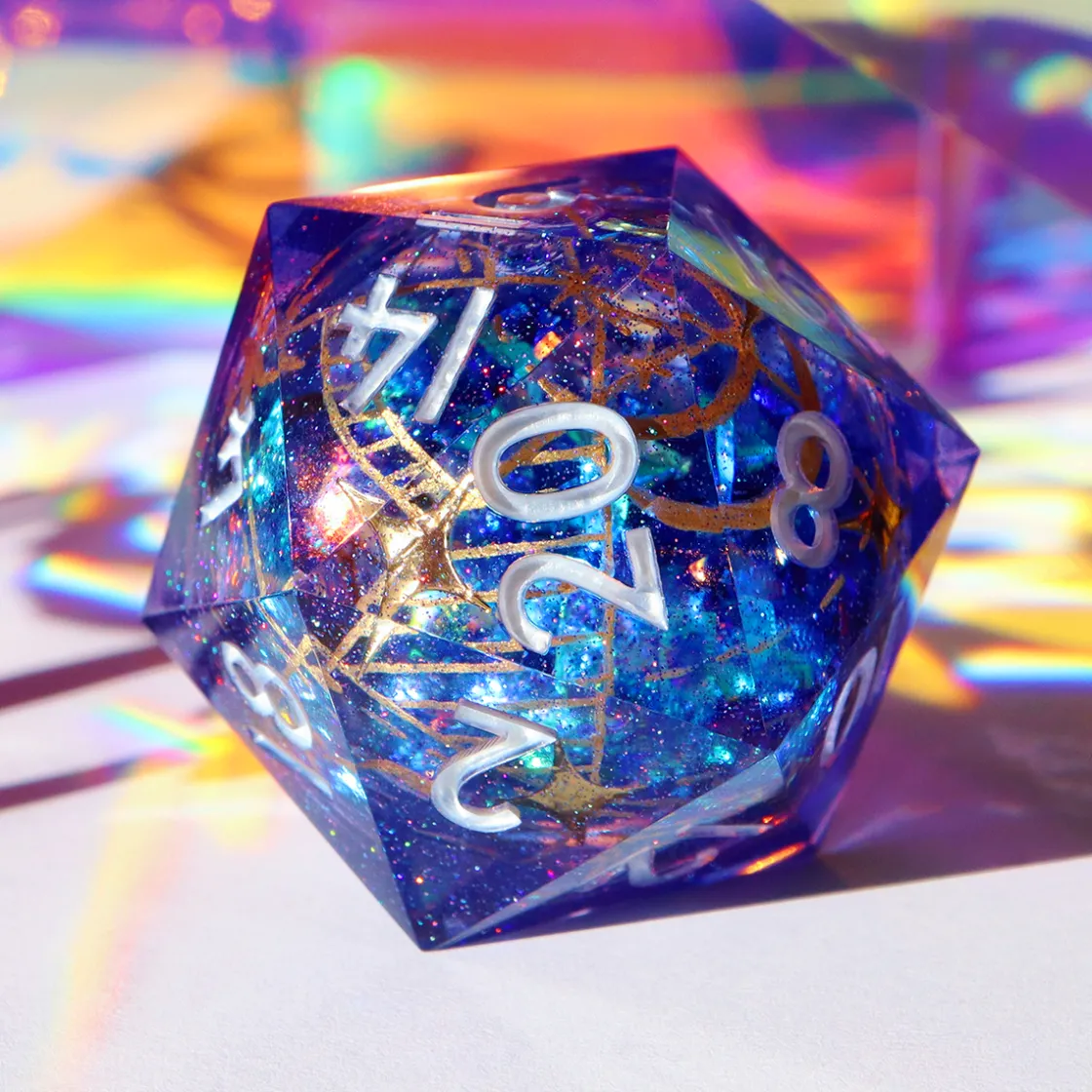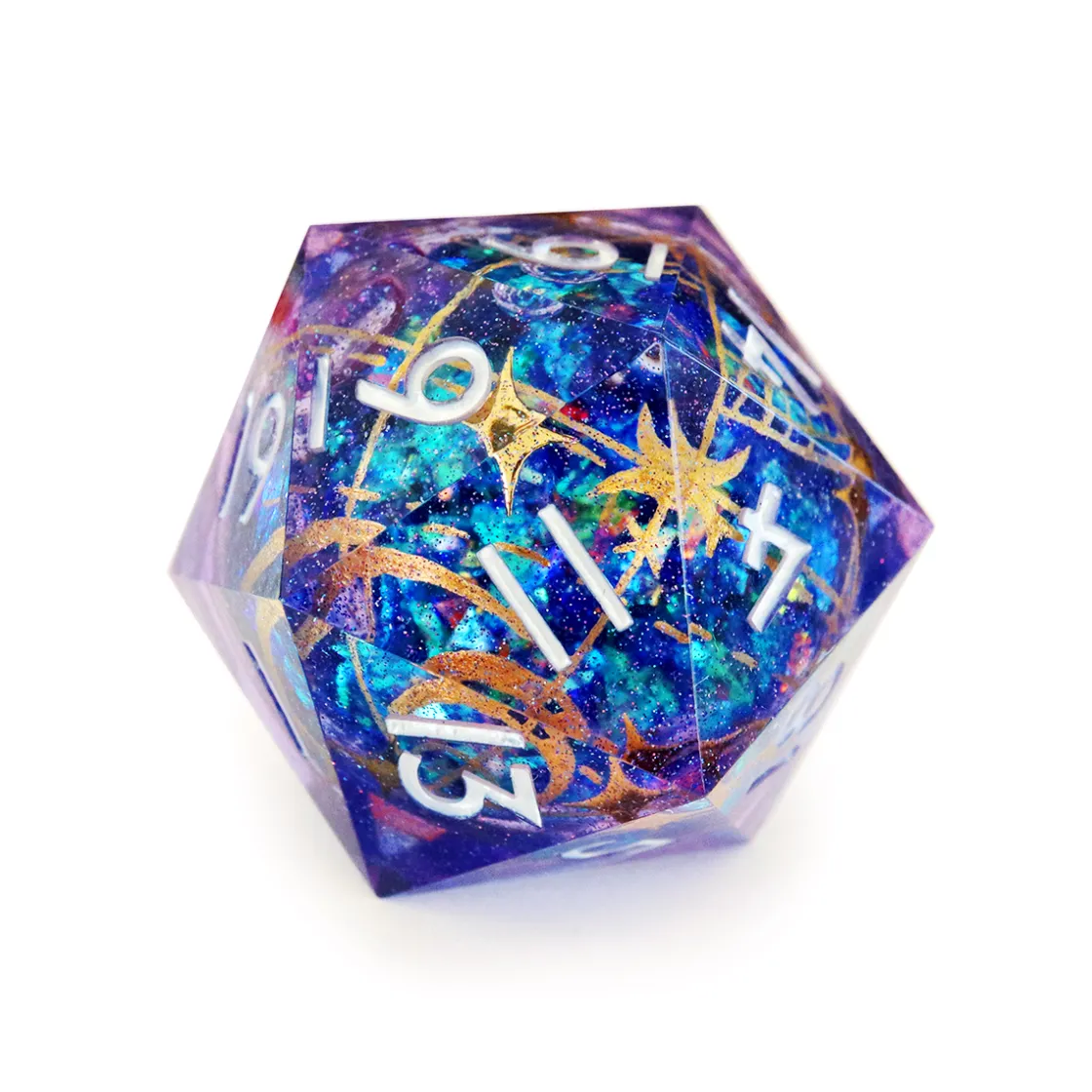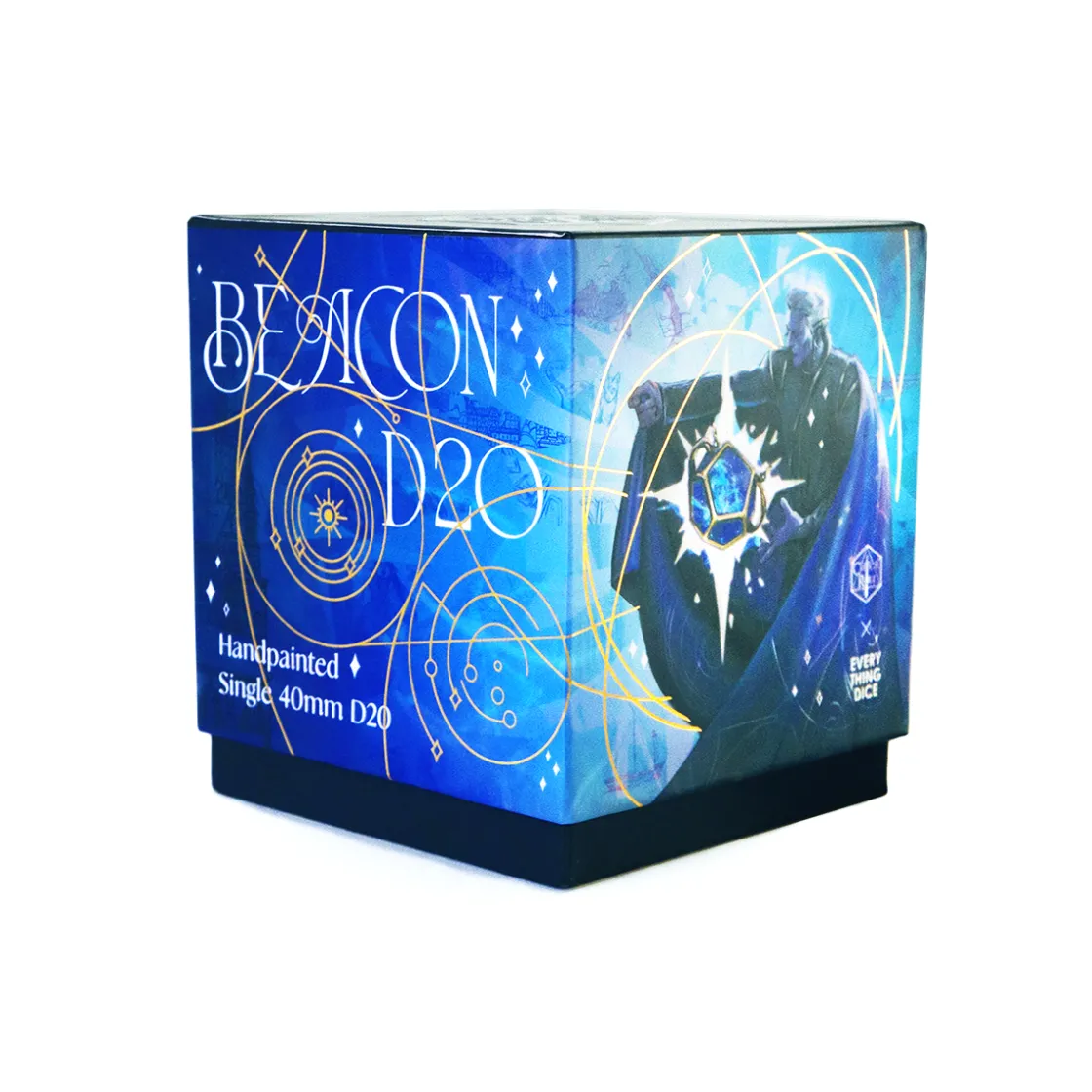Arm your roll with high probability and dunamis with this gorgeous Luxon Beacon Oversized d20 made in collaboration with the master artists at Everything Dice. Housed in a foam and velvet insert for protection, this d20 is a handmade, sharp edged, high grade wear resistant resin die beautifully painted with custom mixed colors and polished with a gemstone finish. Inspired by the sacred relics of the Kryn Dynasty, this d20 features white numbering, a swirling liquid core of glittering stars, and beautiful hand painted golden dunamancy sigils.