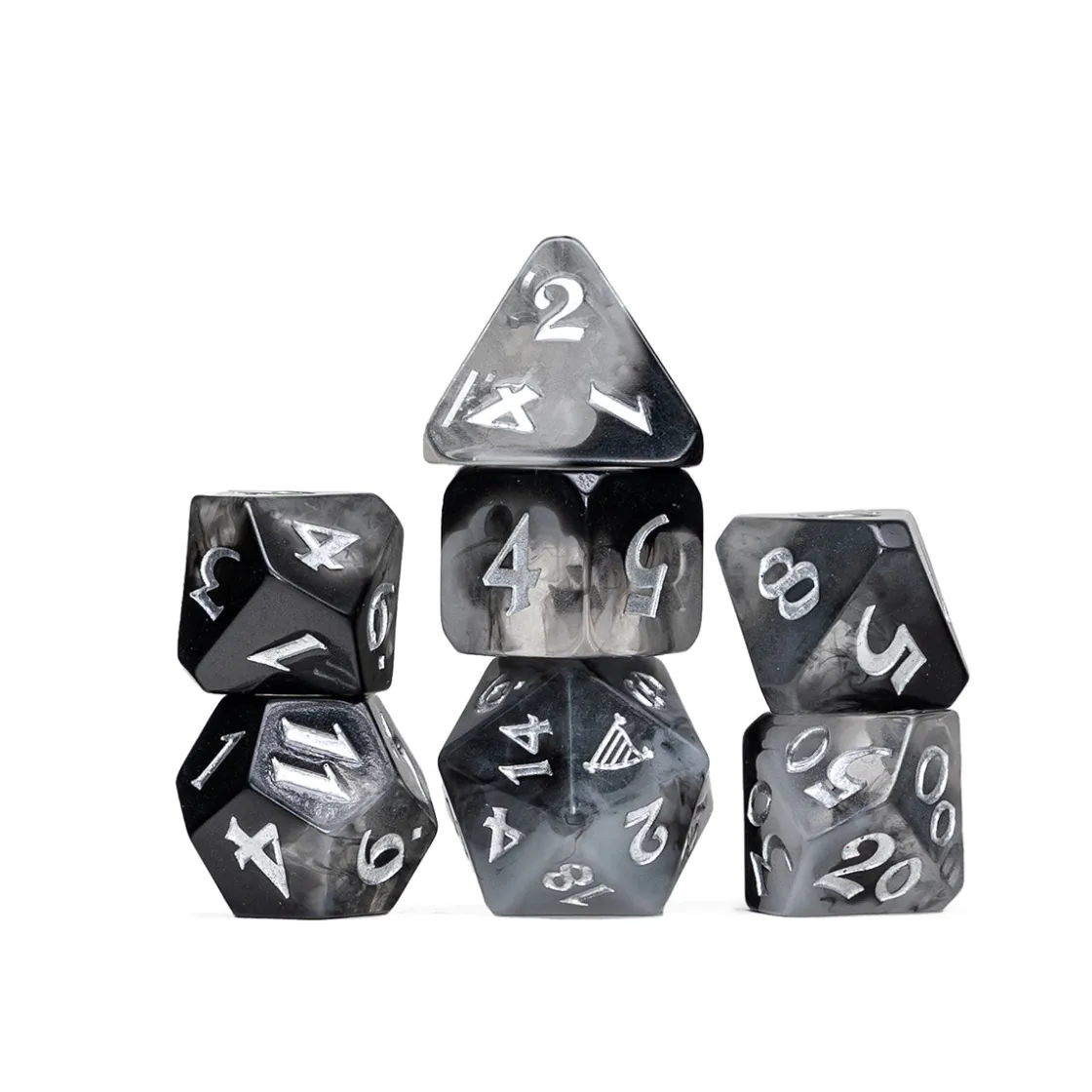 Get ready to rock and rage! Made in partnership with our friends at Die Hard Dice, this Yasha Nydoorin-inspired dice set features silver-inked numbering on cloudy gray dice with wisps of black. The d20 features a bone harp icon on the 20-side.
