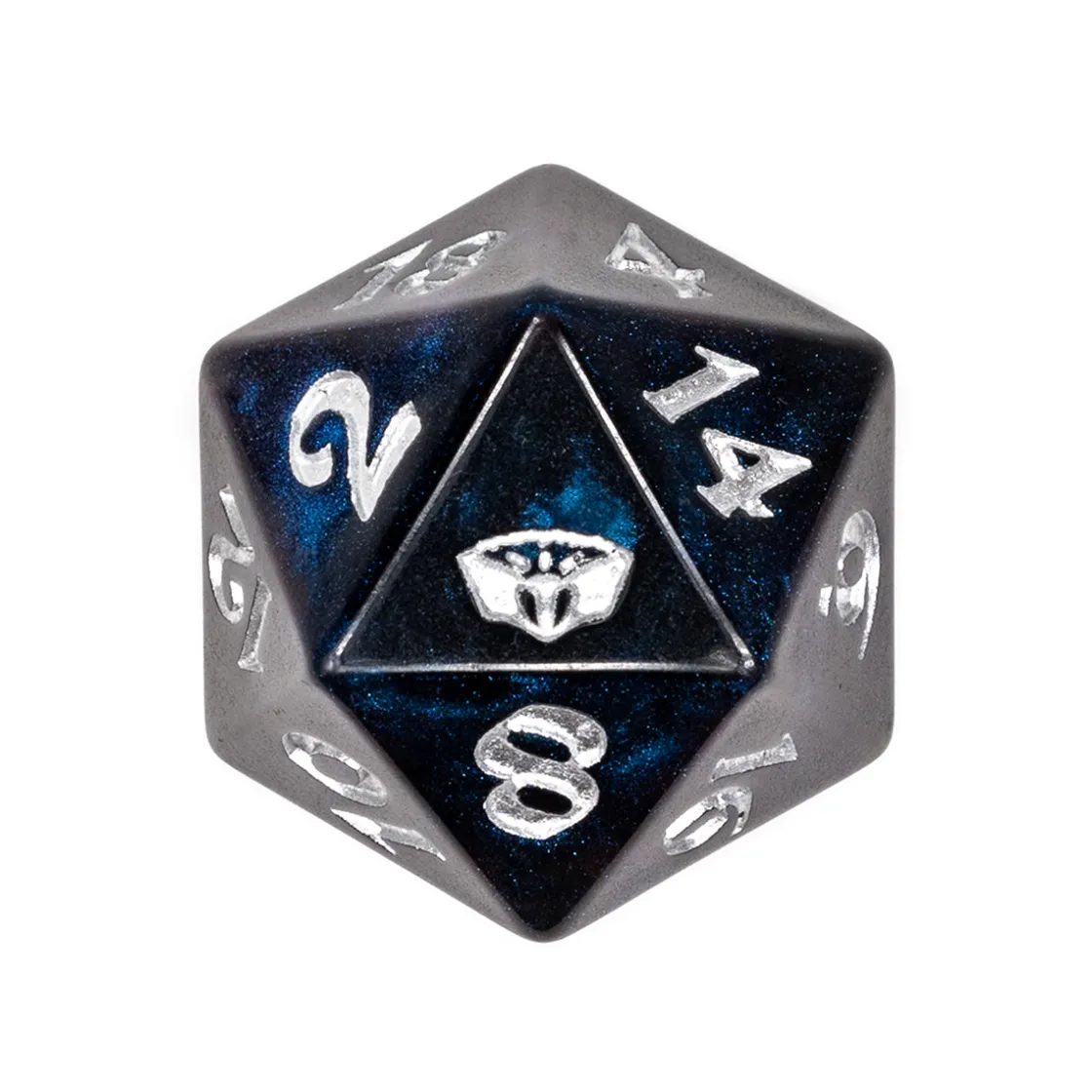 How do you want to roll this? Made in partnership with our friends at Die Hard Dice, this dice set inspired by our own Game Master Matthew Mercer features silver-inked numbering on dice that have a smoky blue to black shift. The d20 features a tome icon on the 20-side.