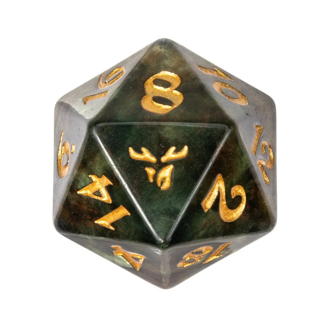 Prepare yourself to pass through fire… Made in partnership with our friends at Die Hard Dice, this Keyleth-inspired dice set features gold-inked numbering on translucent forest green dice with copper splashes. The d20 features an antler icon on the 20-side.