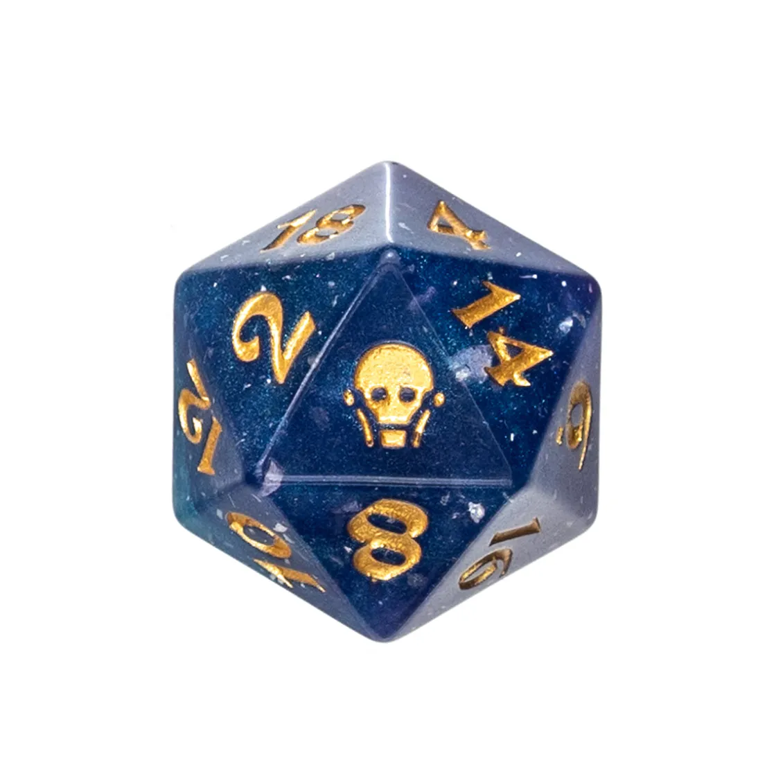 Take this down, adventurer! Made in partnership with our friends at Die Hard Dice, this Taryon Darrington-inspired dice set features gold-inked numbering on a shimmering swirl of teal and blue with flakes of gold. The d20 features a Doty icon on the 20-side.