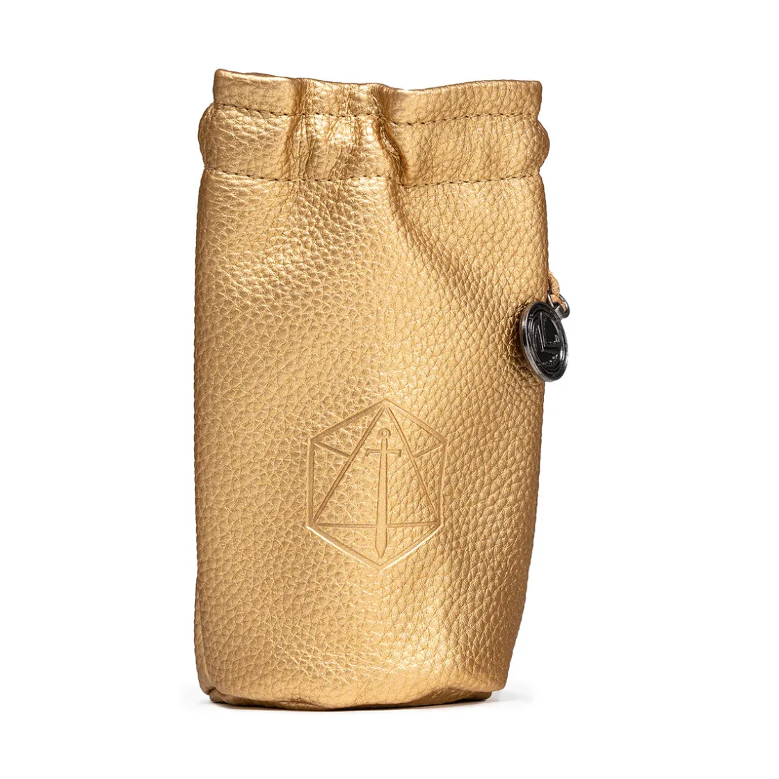 - Dice set arrives in a gold PU leather bag with a debossed Critical Role logo and teal satin lining and gold drawstrings.