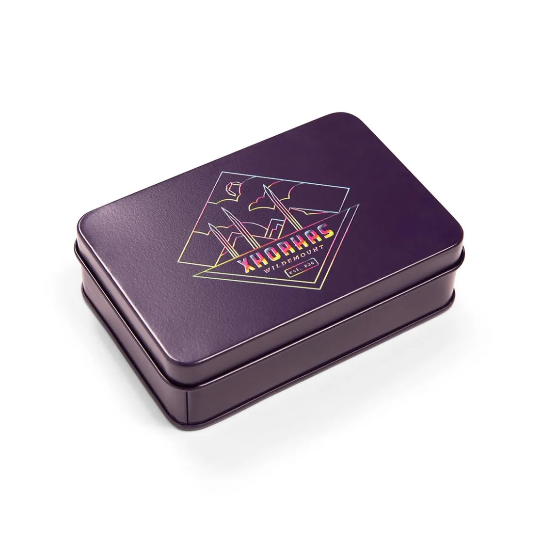 Fight off the terrors of Xhorhas with this beautiful set of 7 polyhedral dice. Housed in a matte finished, deep purple steel box that features the seal of the city, this set of dice is made of solid zinc alloy, embossed with holographic rainbow numbers, with the Critical Role logo printed on the d20.