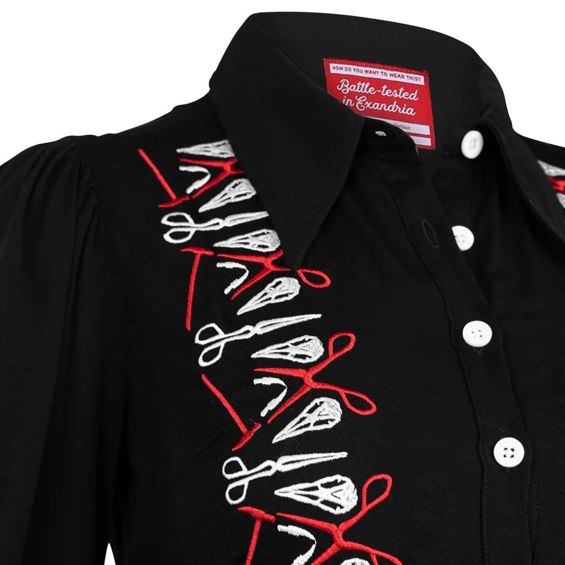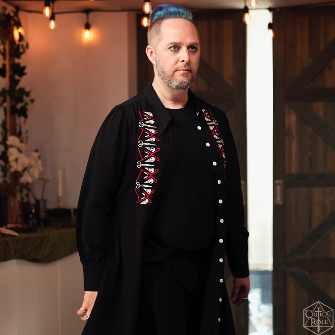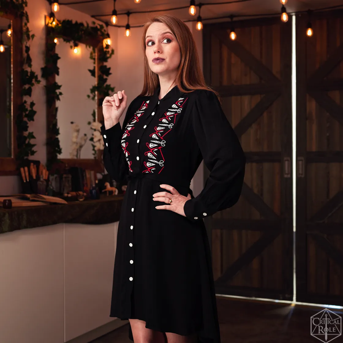 The Laudna Shirt Dress is the fun-scary fashion you didn’t know you needed in your wardrobe! Terrifyingly chic, the black, hi-lo hem button down dress features a gorgeous embroidered panel design with black, red, and white satin stitching across the front, and long lantern sleeves with a 3-button cuff and contrast stitching. With a long-pointed collar and a fetching tie at the back waist, this dress offers a little razzle-dazzle for Critters to wear this as a cosplay or for a night on the town.