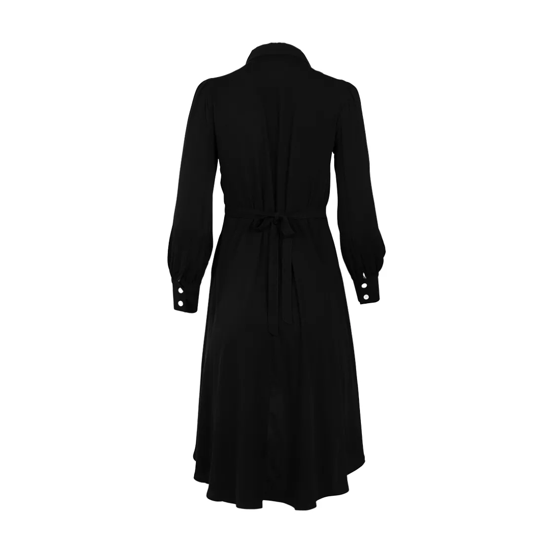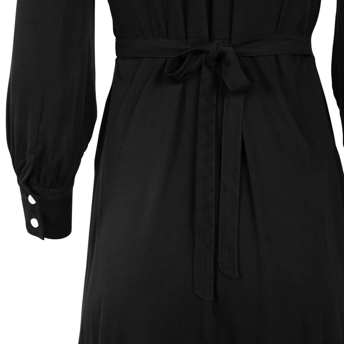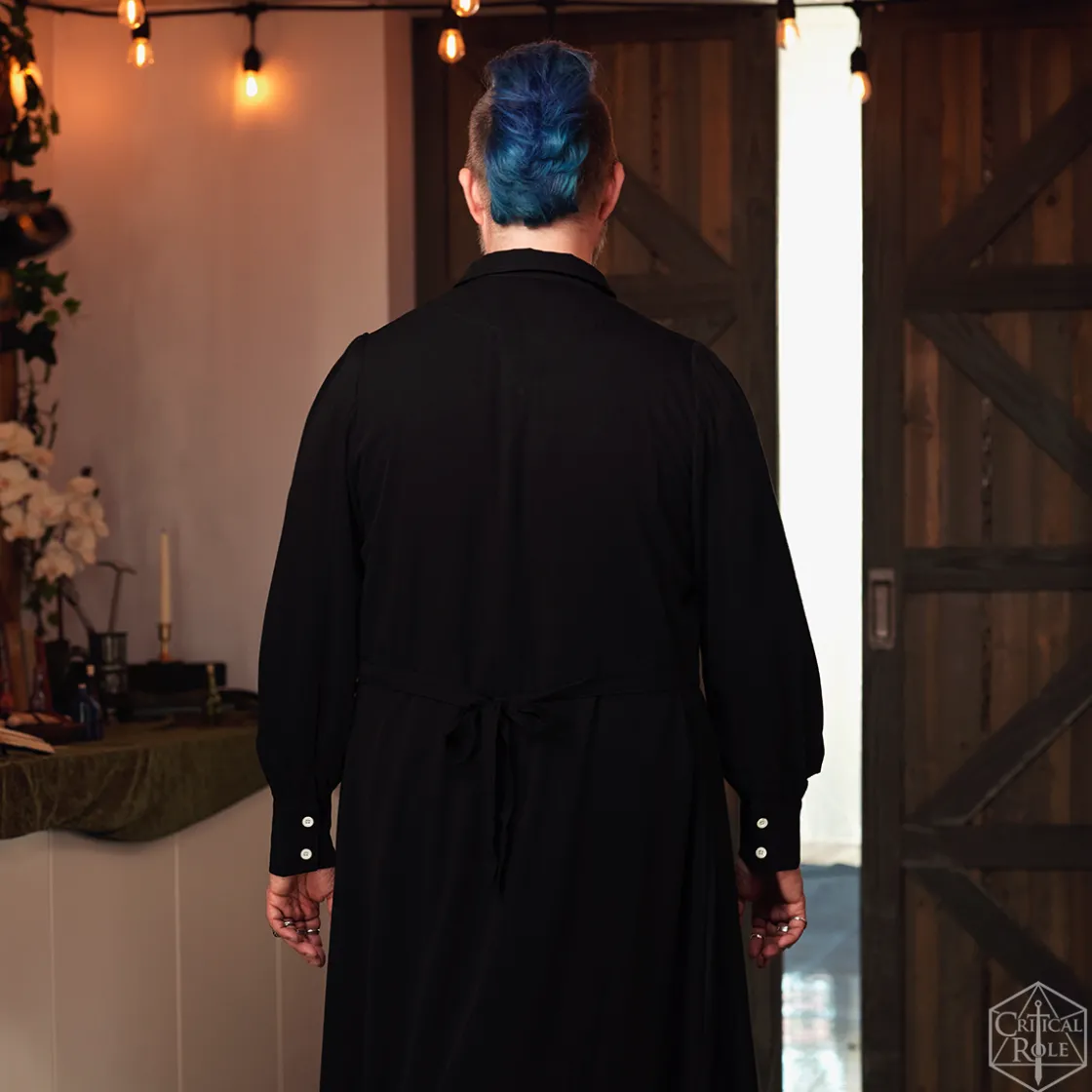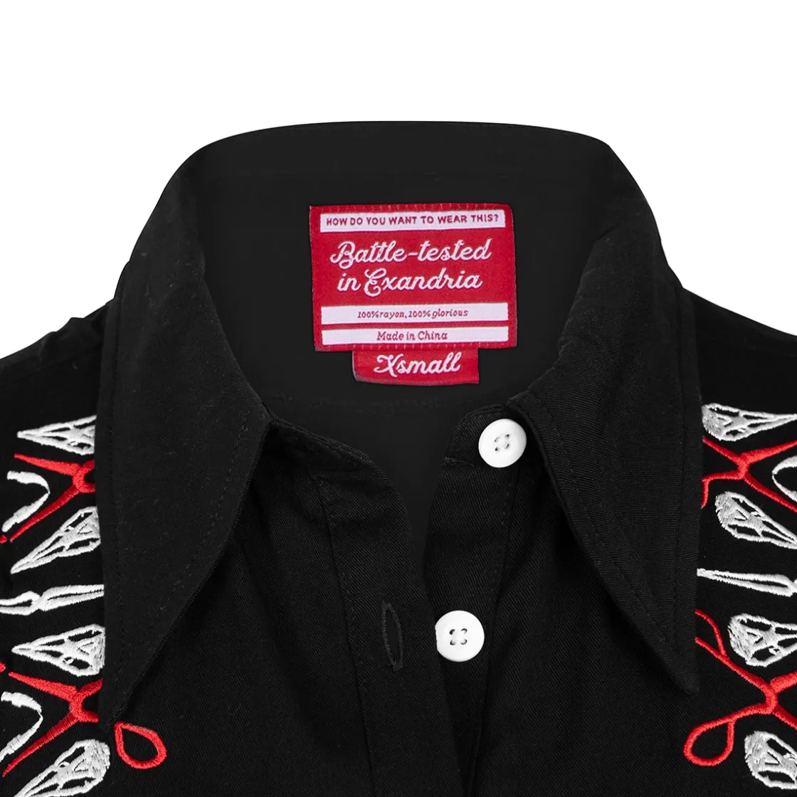The Laudna Shirt Dress is the fun-scary fashion you didn’t know you needed in your wardrobe! Terrifyingly chic, the black, hi-lo hem button down dress features a gorgeous embroidered panel design with black, red, and white satin stitching across the front, and long lantern sleeves with a 3-button cuff and contrast stitching. With a long-pointed collar and a fetching tie at the back waist, this dress offers a little razzle-dazzle for Critters to wear this as a cosplay or for a night on the town.