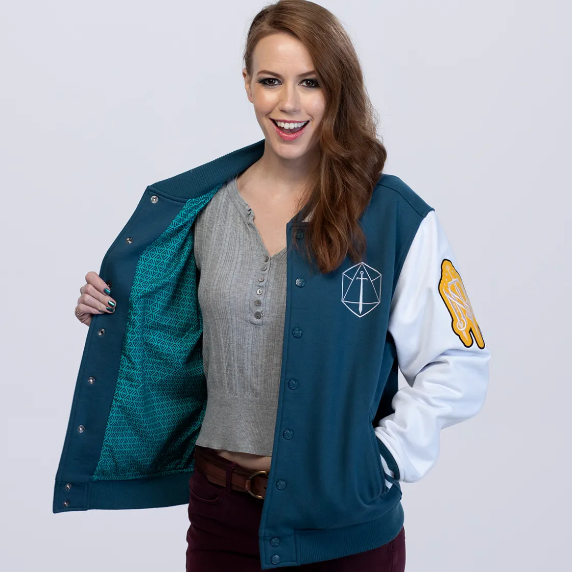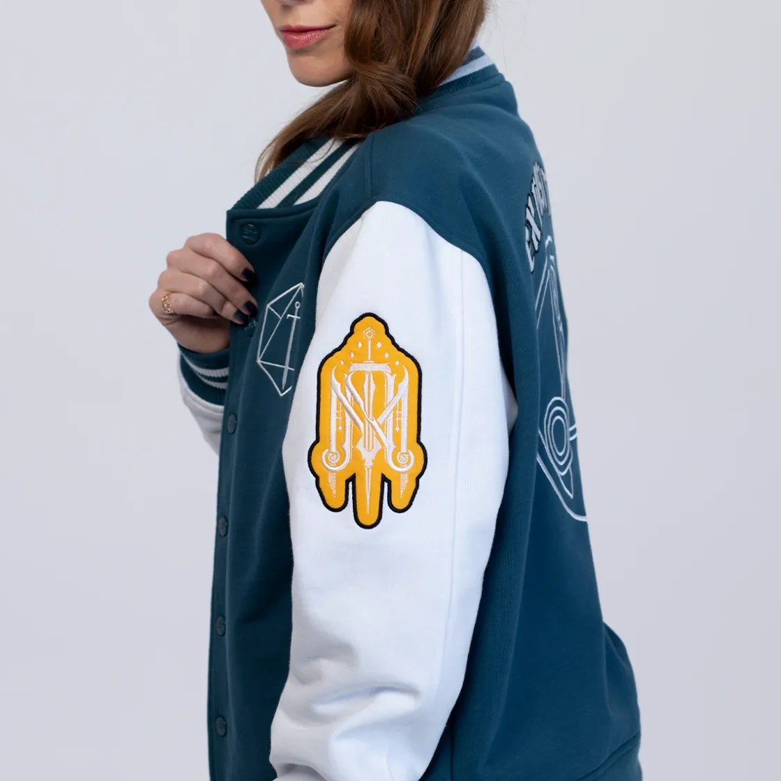Modeled after the classic high school letterman style, this jacket features the Critical Role sword logo on the left breast and a Mighty Nein crest patch on the left sleeve. The back is embroidered with the Cobalt Soul symbol below lettering of EXPOSITOR. The inside of the jacket features lining with patterning based on Beau’s very first robe for a hint of her rebellious roots before she became an expositor.