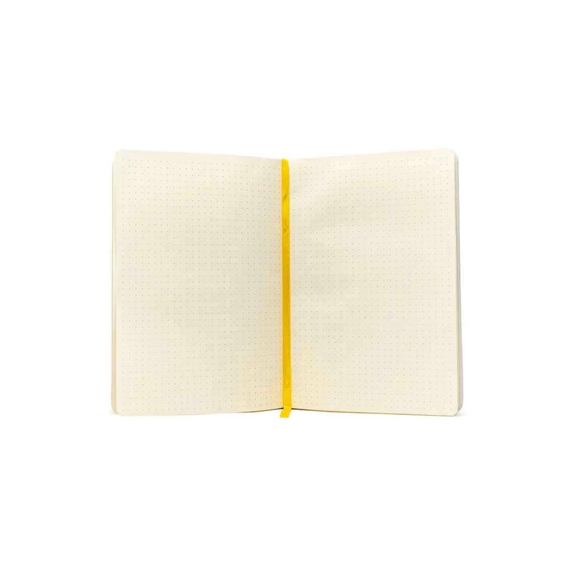 - Matching bright yellow ribbon bookmark and elastic band closure