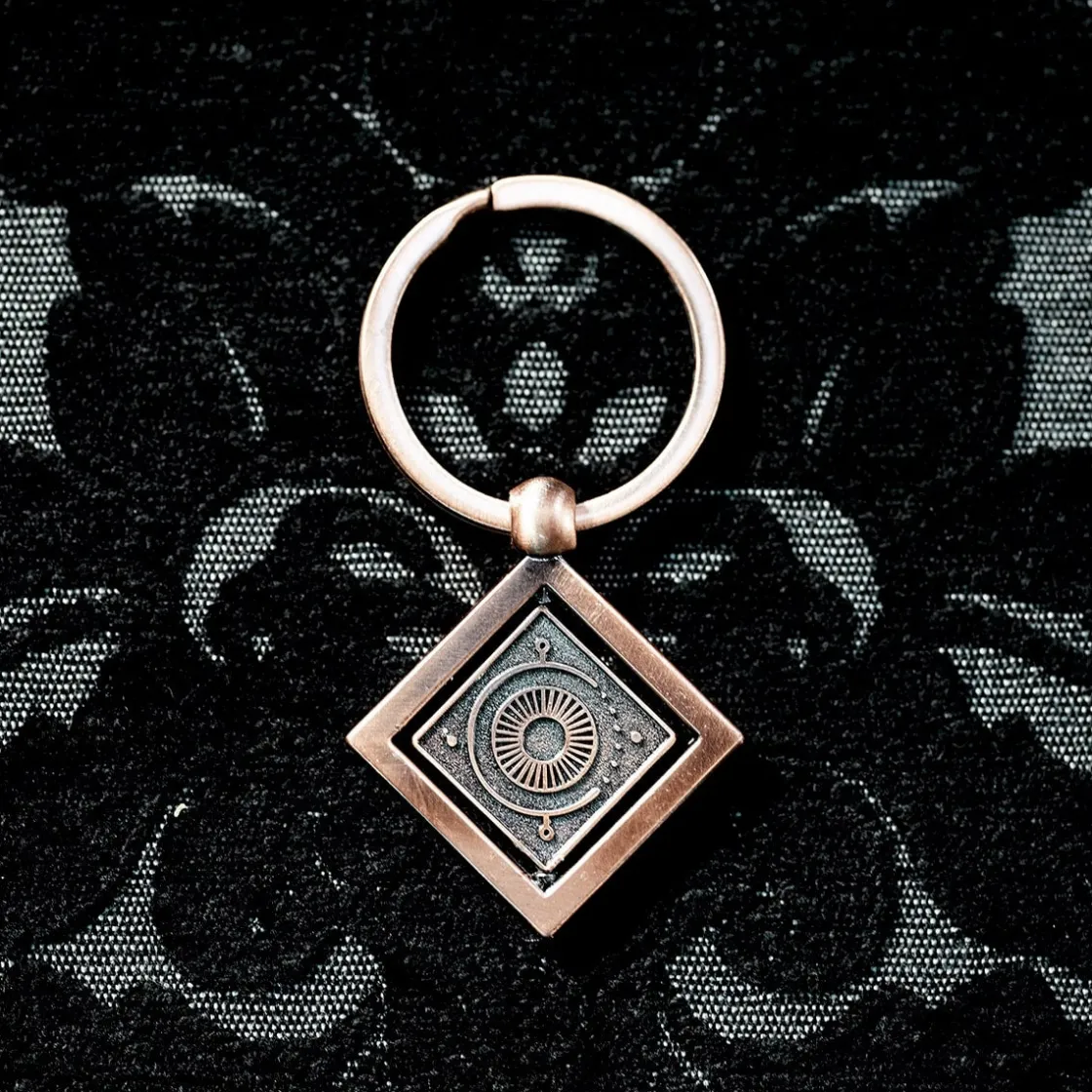 Celebrate your membership in the circle and keep your keys secure with the Candela Obscura Spinning Keychain. Made of distressed metal, the members-only keychain has a diamond shaped spinner that turns on a vertical axis and brandishes the official logo on one side, with the official name of the secret society on the other.