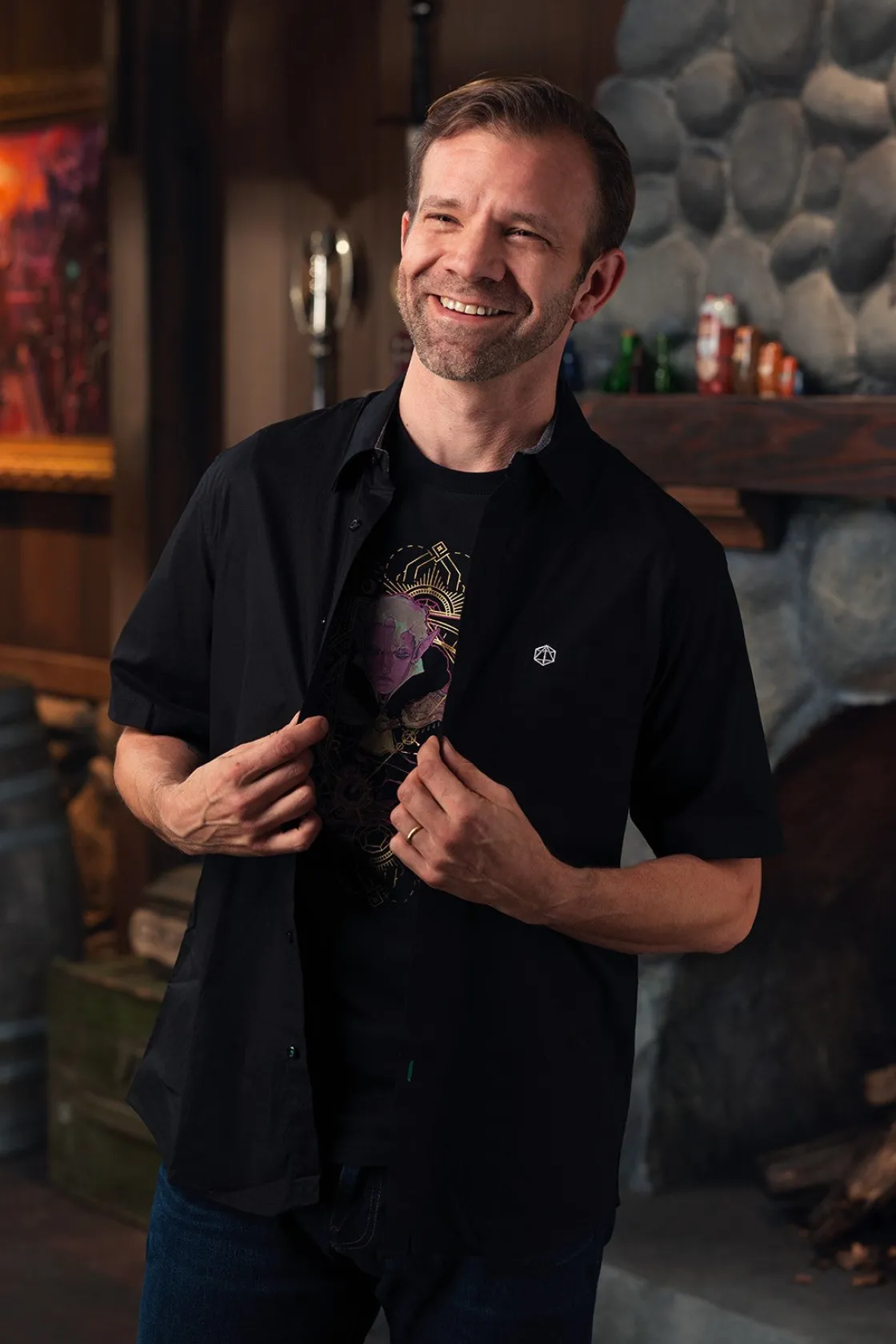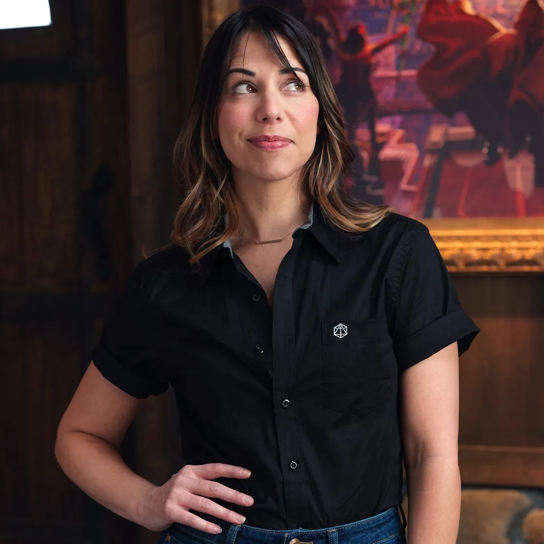You can effortlessly wear your nerdiness to the office, dinner, or a night on the town with the Critical Role Button Down Shirt. This versatile black, unisex, short sleeved shirt features a front left pocket embroidered with the Critical Role logo and is easy to dress up or down with your favorite jeans, shorts, khaki pants, or skirts.