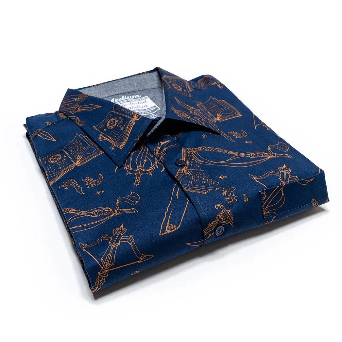 Add some nerdy-chic to your wardrobe with this snazzy button down short sleeve shirt, adorned in a pattern featuring the Mighty Nein’s crest and signature weapons… Yes, books are very dangerous weapons.