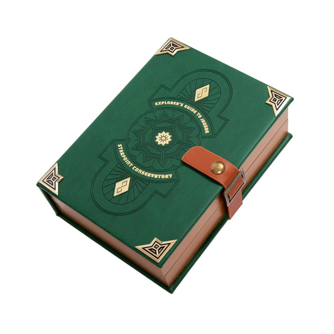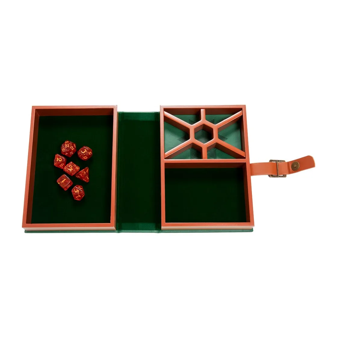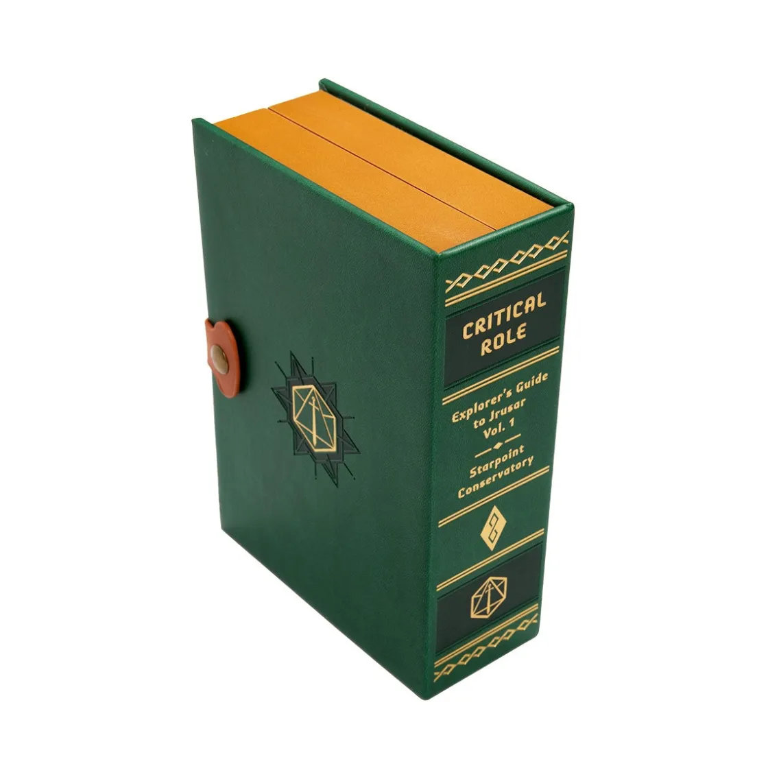 Disguised as a book—Explorer’s Guide to Jrusar from the Starpoint Conservatory—the Critical Role Dice Tome Rolling Tray is wrapped in dark green faux leather and detailed with antique debossed metal in gold. Crack open this tome to reveal your dice, ready for Rollies on the felt-lined full rolling tray on the left, while the right side is divided for rolling and storage of accessories and minis.