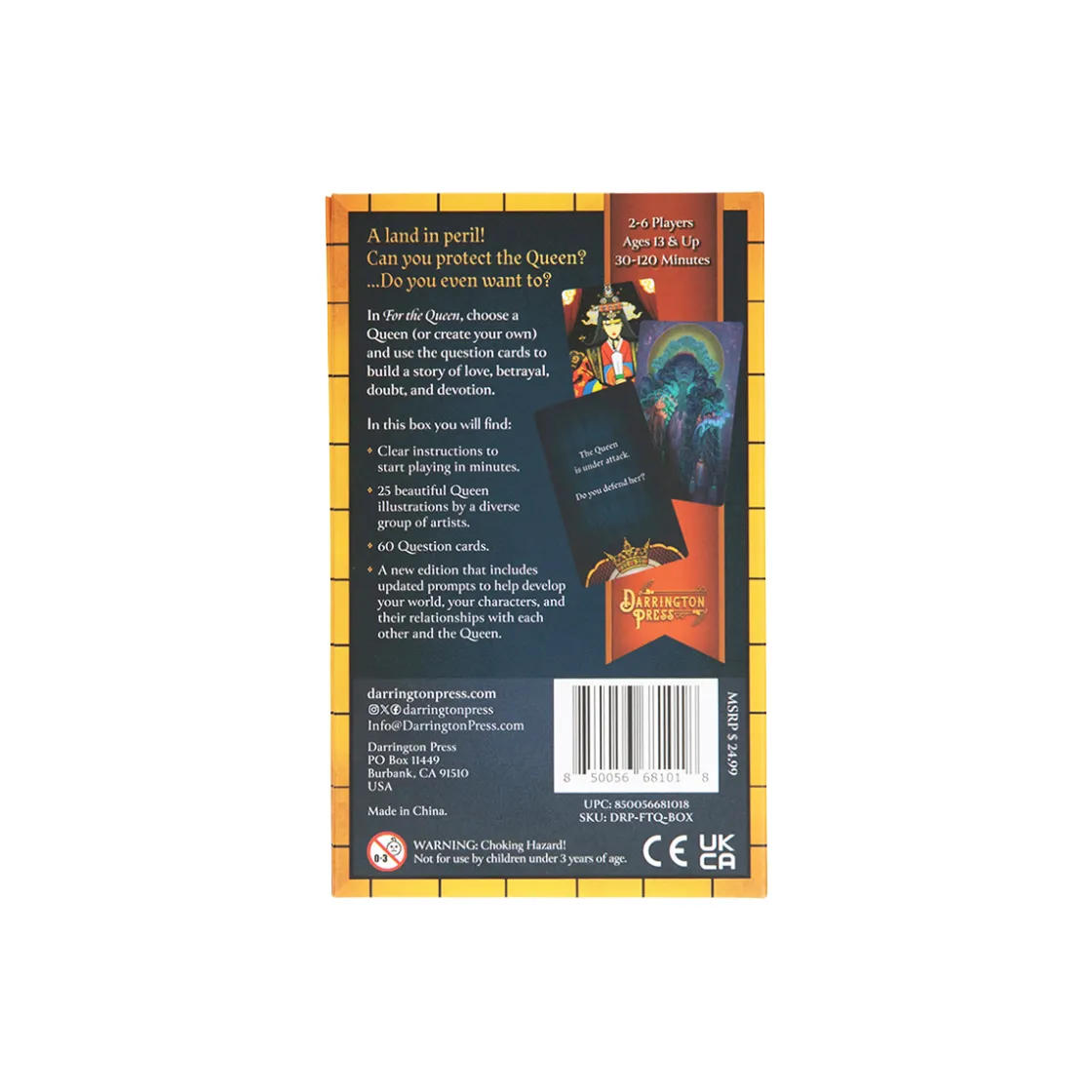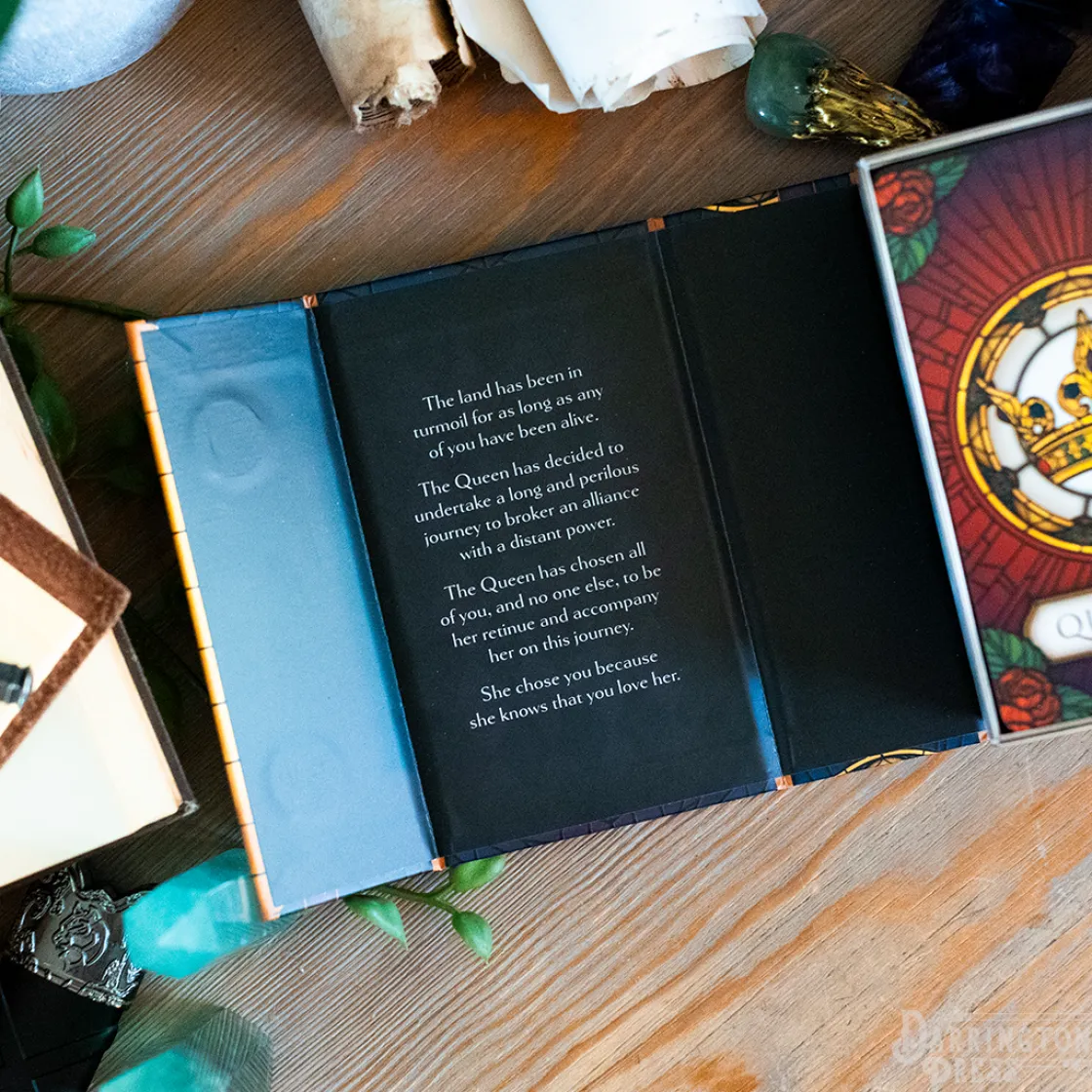 Get started by choosing your Queen from among 25 lavishly illustrated Queen cards—or create your own! Launch into gameplay in minutes with the guided Rules cards, then read and answer the Question cards to develop a world, your characters, and their relationships with each other and the Queen. Ultimately, answer the final question: when your Queen is attacked, do you defend her?