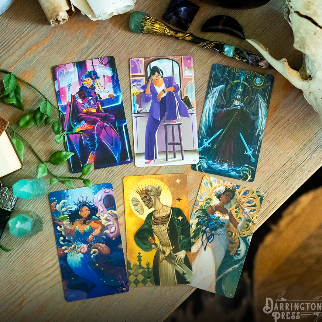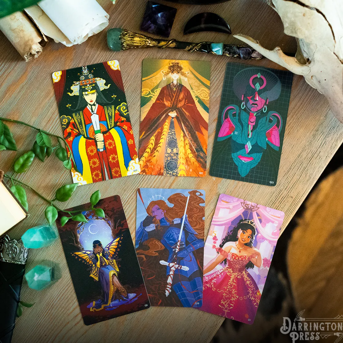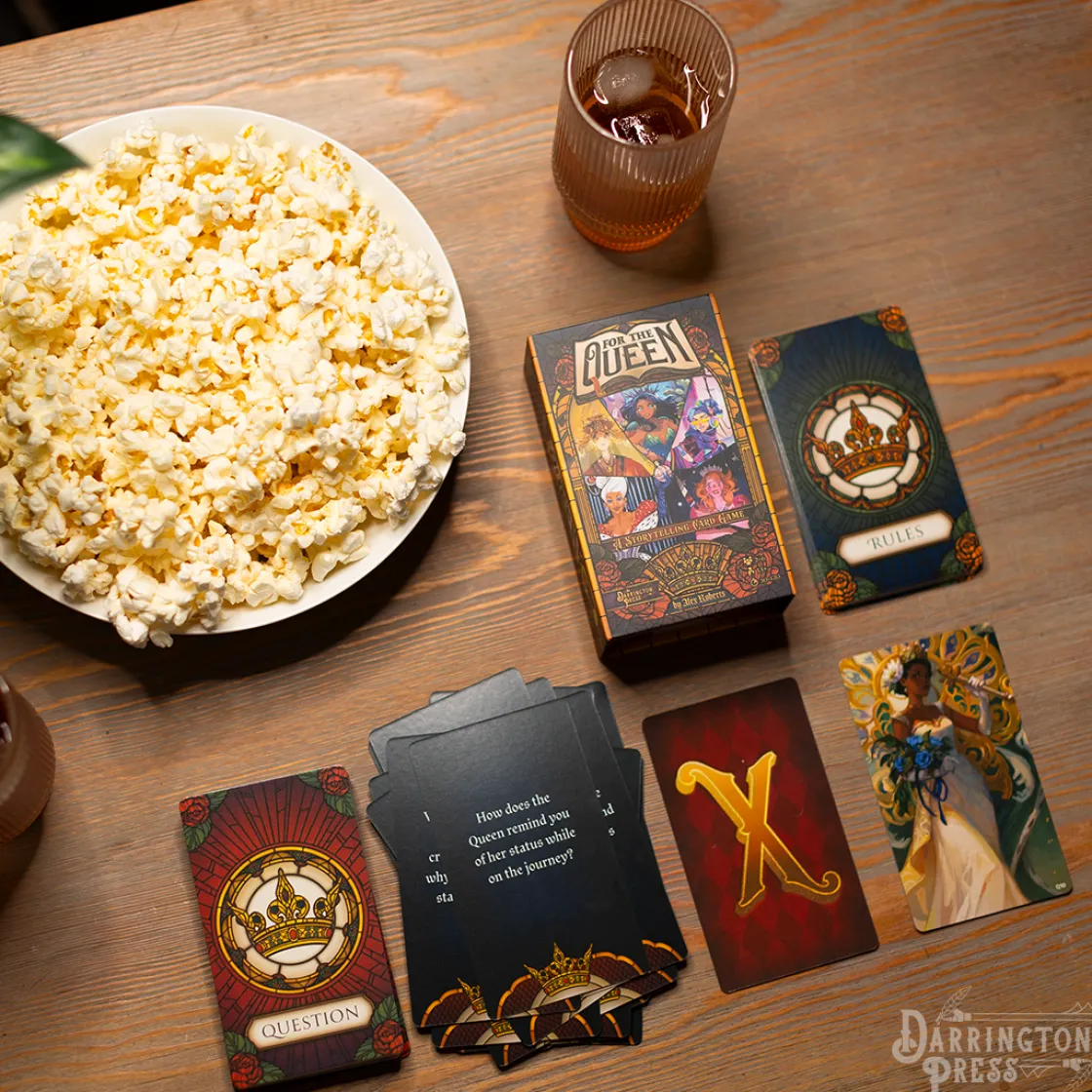 The 91 cards come in a travel-ready box with a ribbon perfectly placed for easy card removal, making this game ideal for on-the-go gameplay at a convention, around a campfire, or waiting in line at the DMV! With 25 uniquely illustrated Queens to inspire you, and taking place in any genre or setting you choose, you’ll never tell the same tale twice.