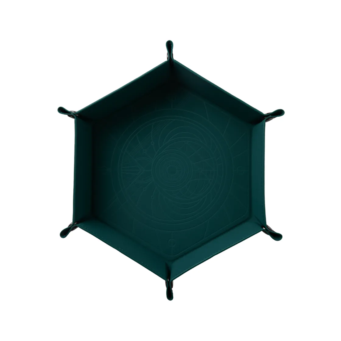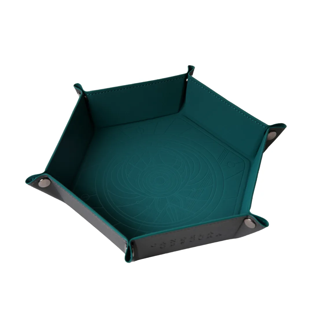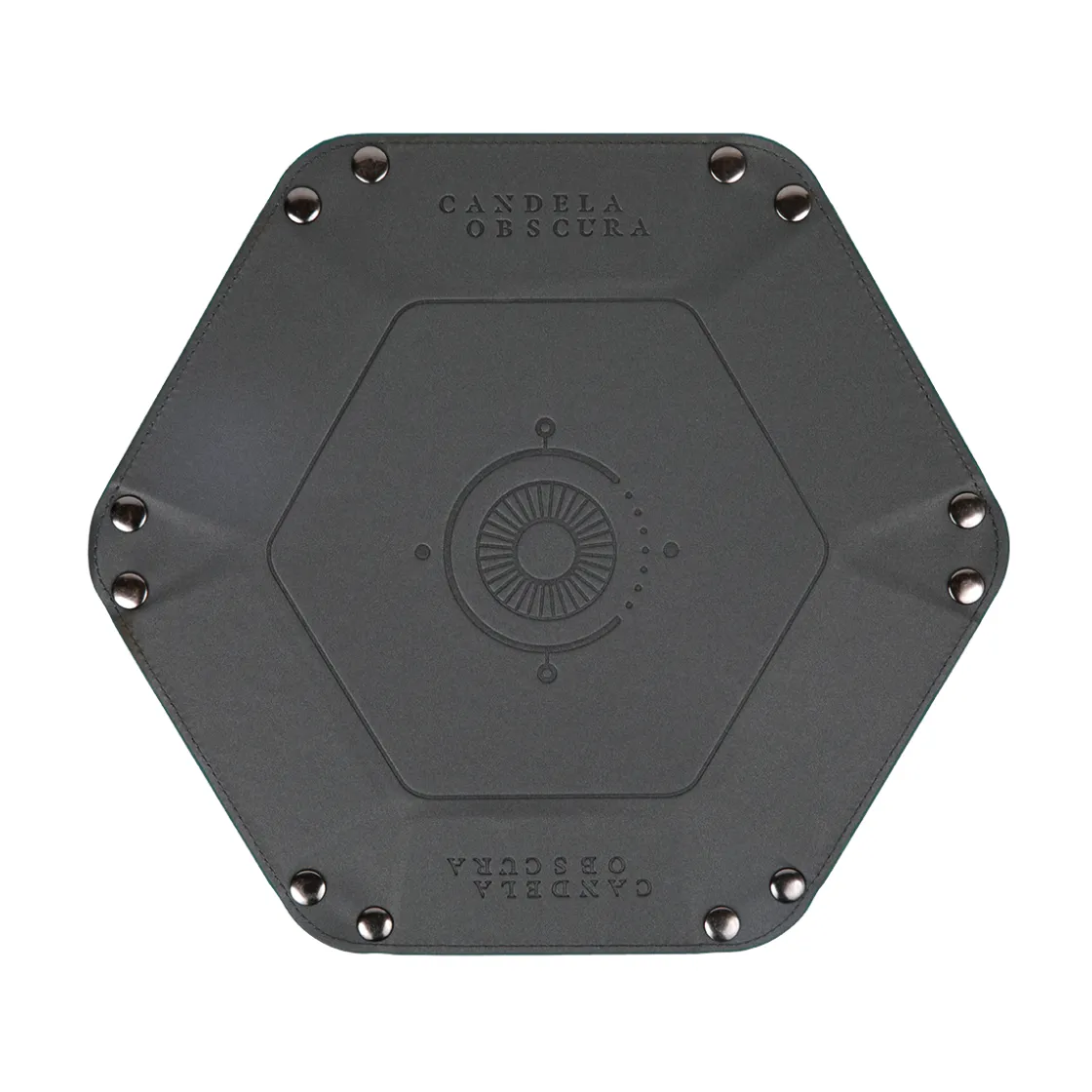 Level up your adventures through the Fairelands or anywhere you go with the conveniently portable Candela Obscura collapsible dice tray, fully equipped with metal snaps for easy assembly. This magickally cool table accessory is teal and gray, featuring a debossed design of the astrolabe on the teal side and the Candela Obscura logo on the gray side.