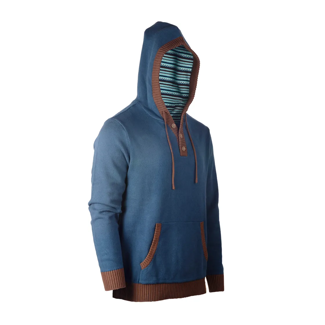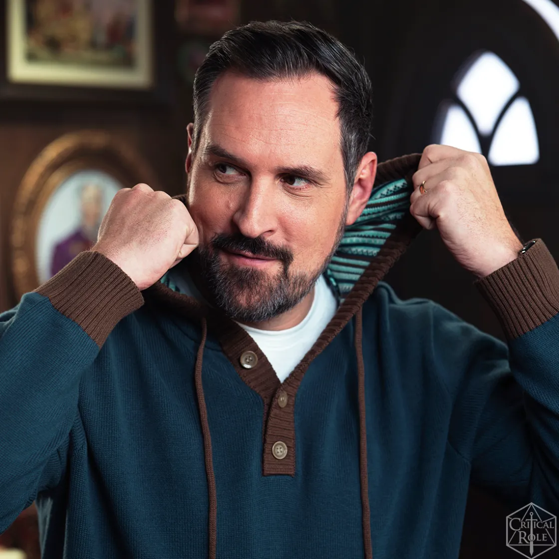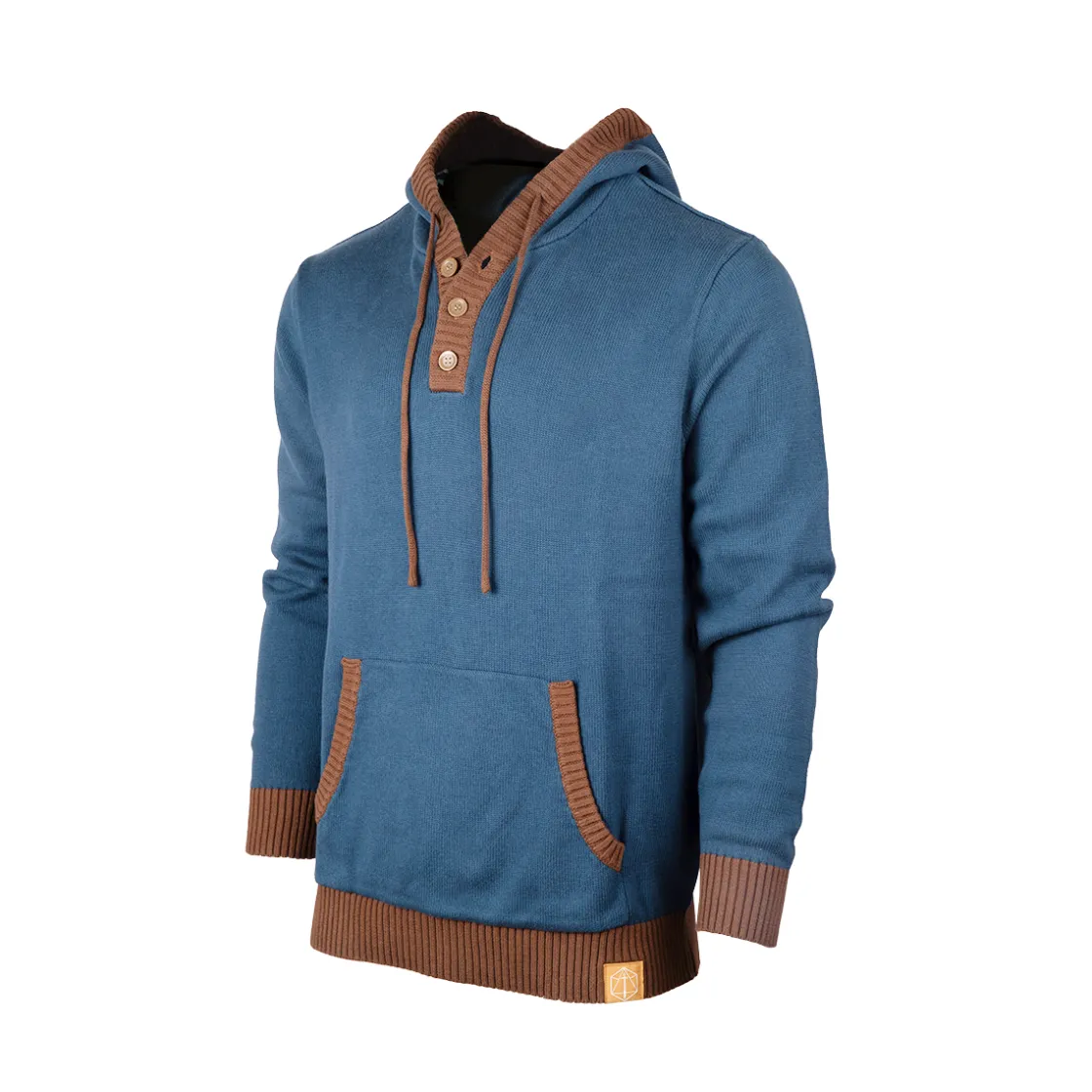 Inspired by the rustic woodworker, Chetney Pock O’Pea, this casually cozy pullover hoodie features a large front kangaroo pocket and contrasting knit ribbed cuffs, hem, and collar that encloses with three wood textured buttons. The lining of the full hood has a knitted pattern inspired by Chetney’s signature hat.