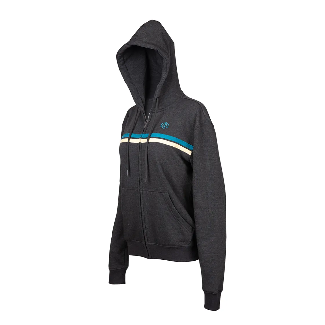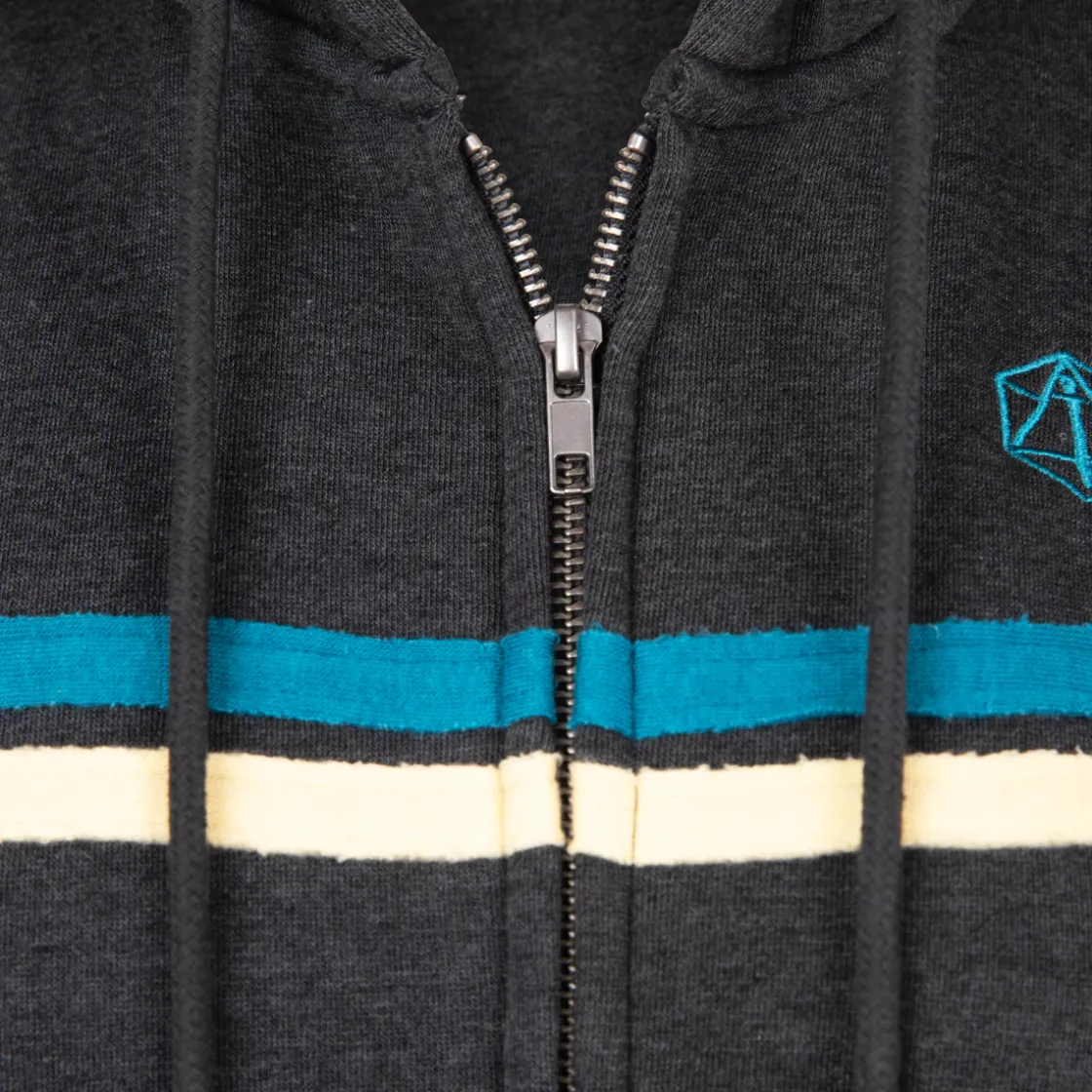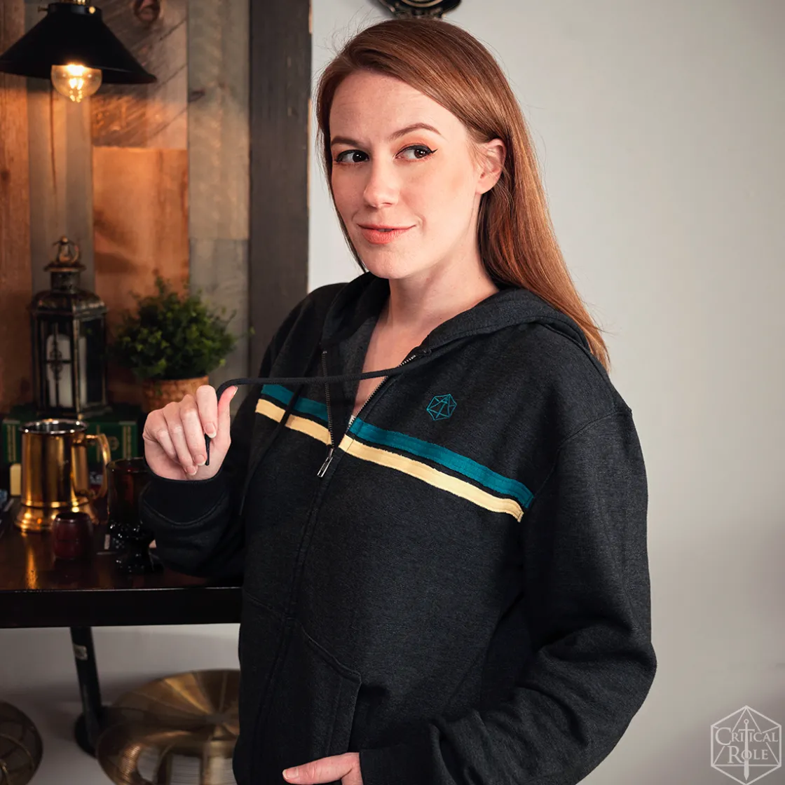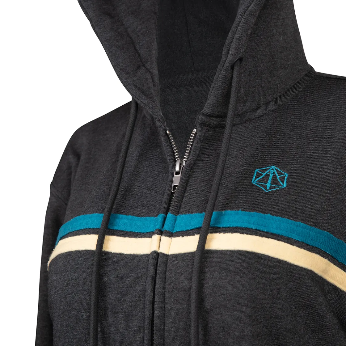 Stay warm and cozy in this fetching Critical Role Retro Hoodie featuring teal and yellow raw edged stitched stripes across the upper chest, a full front zip-closure, roomy kangaroo pockets, and a full hood with drawstrings. Whether running errands or lounging at home, the relaxed fit and charcoal gray color offer an easy-to-style look to rock with the Critical Role Retro Jogger, as well as your favorite jeans or pants.
