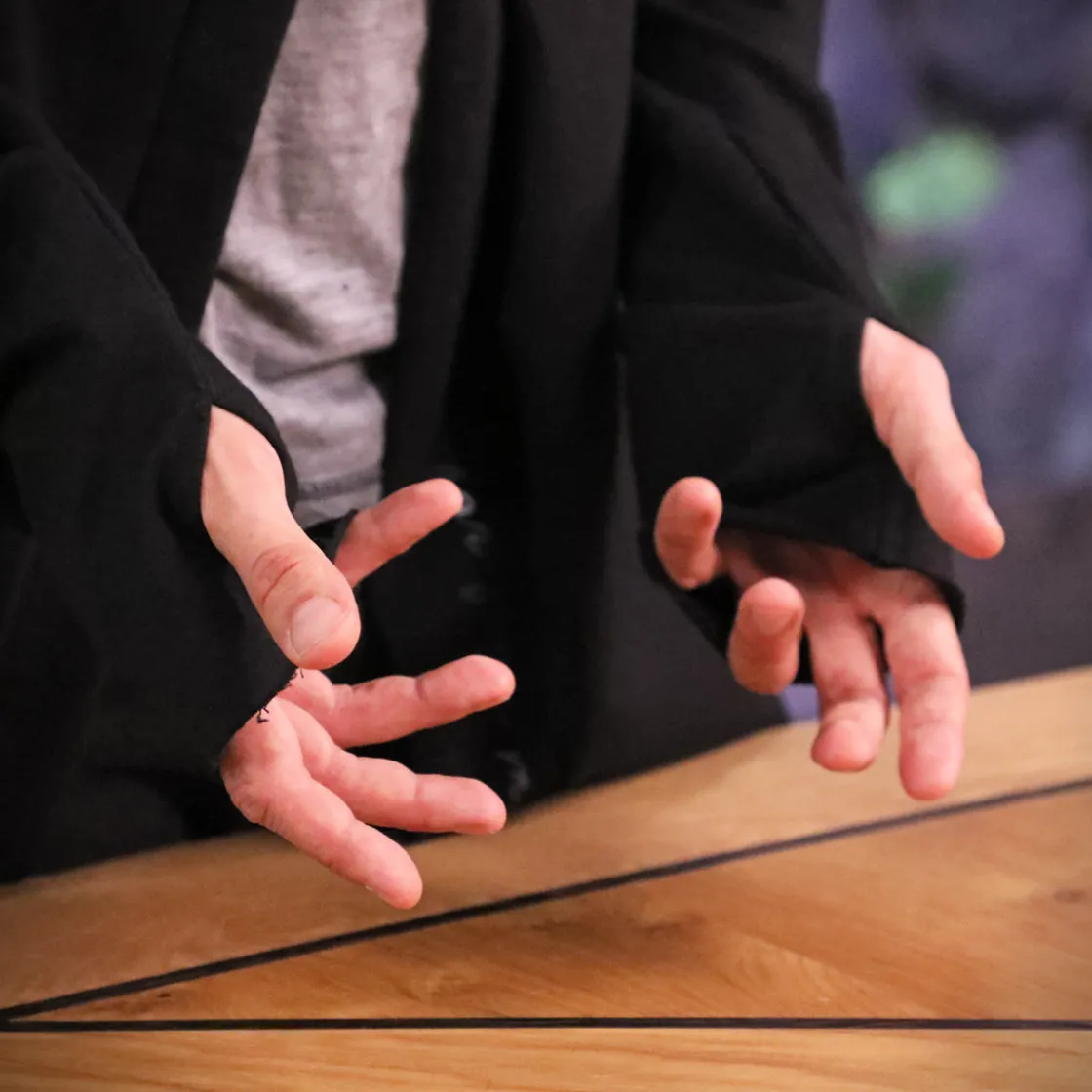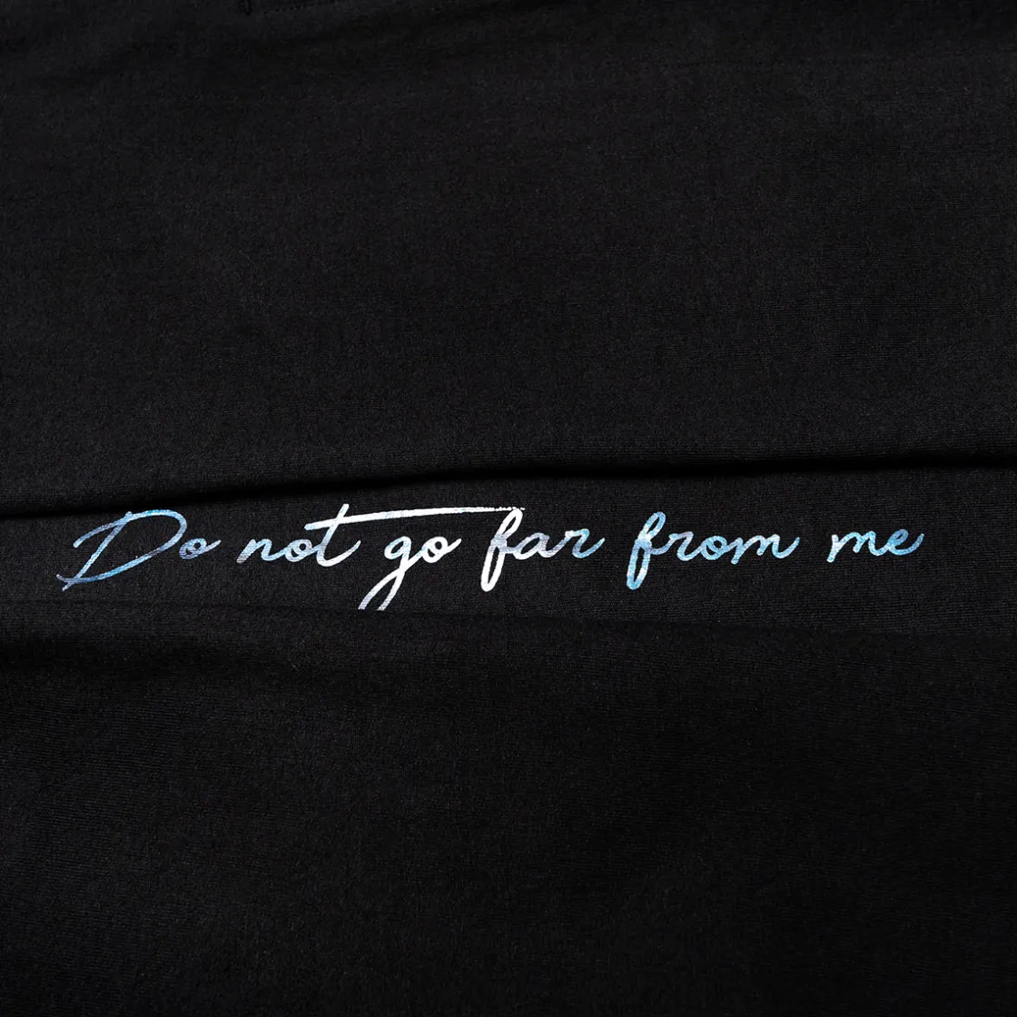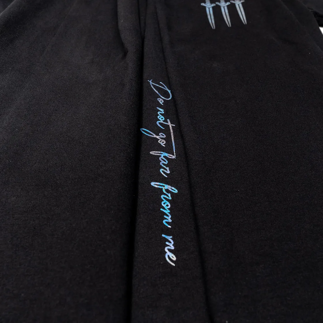 Embrace your inner rogue with this Vax’ildan Hooded Cloak! This cloak is danger on the outside, heart on the inside, just like Vax himself. The back is adorned with iridescent foiled wings fit for a champion. Three daggers defend the wearer’s chest, while in the same location on the inside of the cloak, a snowdrop is tucked against the heart. Vax’s foreboding line to his sister, “Do not go far from me,” runs down the inside of the hemline.