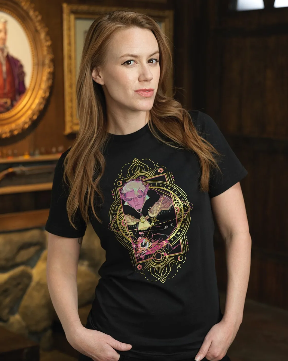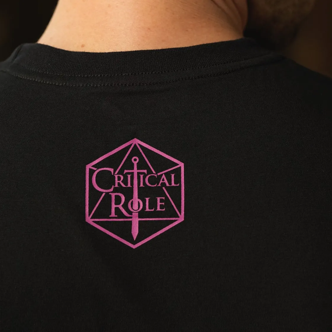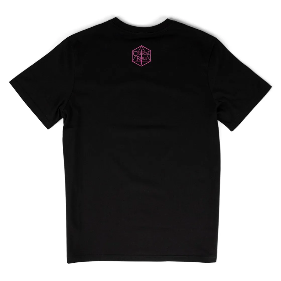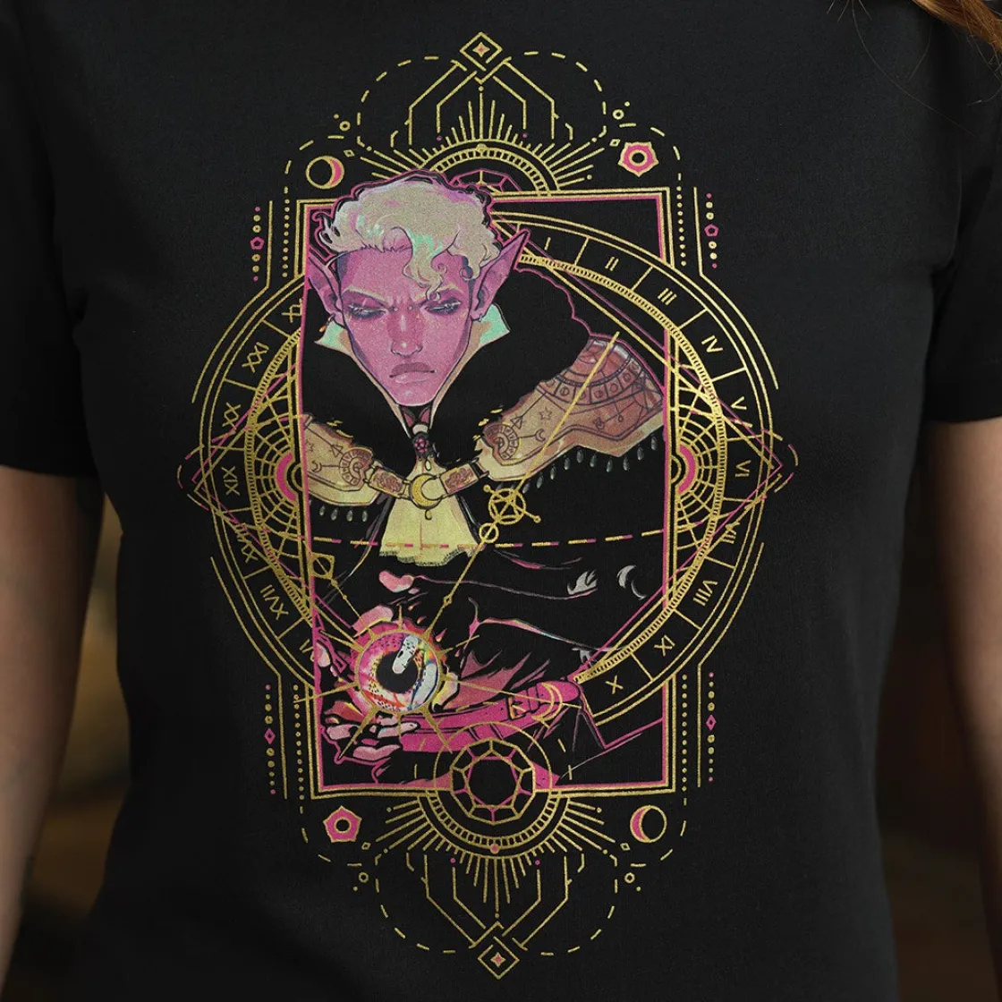 Add some enchantment to your wardrobe with this art-deco styled, unisex t-shirt featuring Essek Thelyss. The front has an oversized retro sci-fi inspired design of the handsome wizard and his magical globe and glyphs in metallic gold and pink hues with the Critical Role logo on the back.