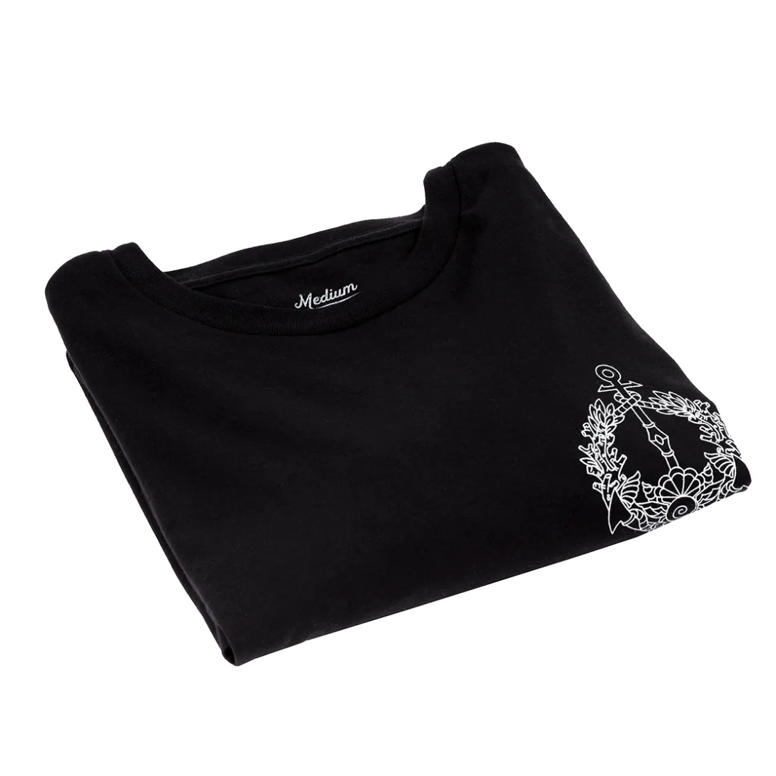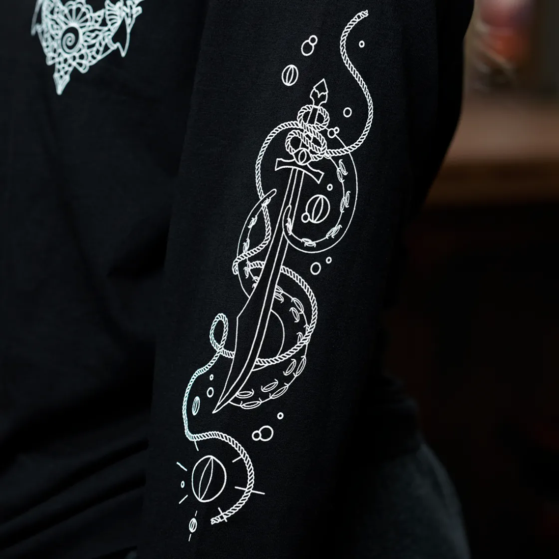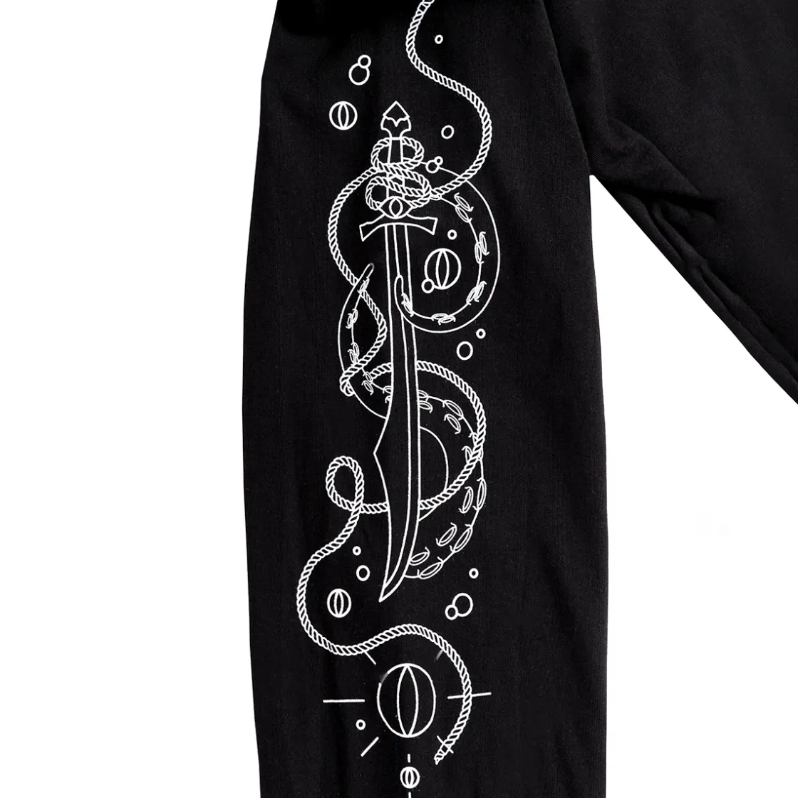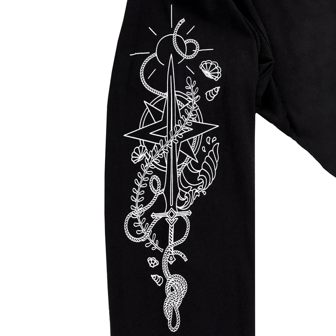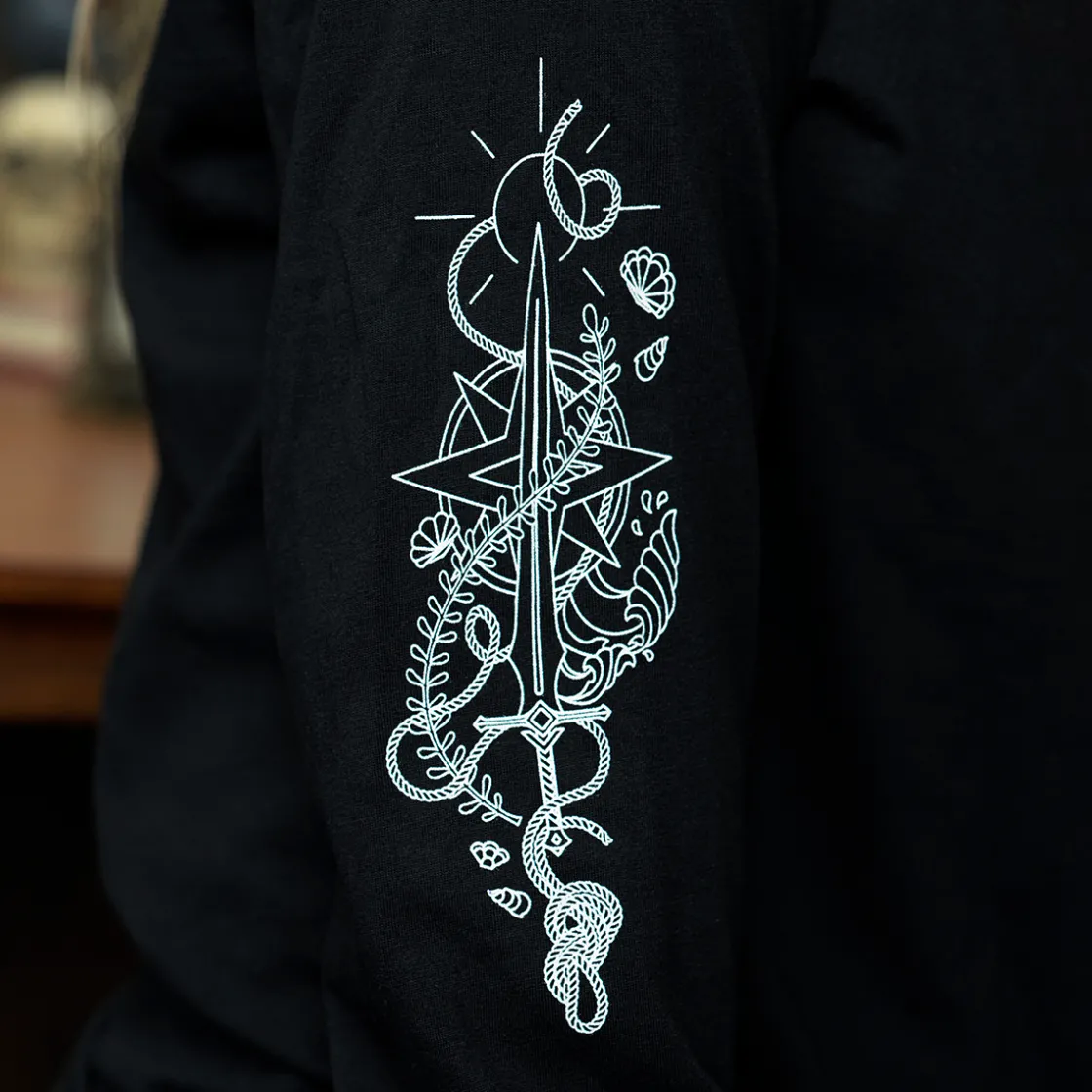 Embody the duality of Fjord Stone’s past and present with a long sleeve t-shirt that captures the symbols of power that forever shaped our sea captain. The left sleeve features the Sword of Fathoms gifted by Uk’otoa surrounded by sunken cloven crystals, the right sleeve features the Star Razor and compass that leads towards a new path fjorged. Upon the chest rests an anchor entwined with a special symbol given to Fjord Stone by Caduceus Clay.