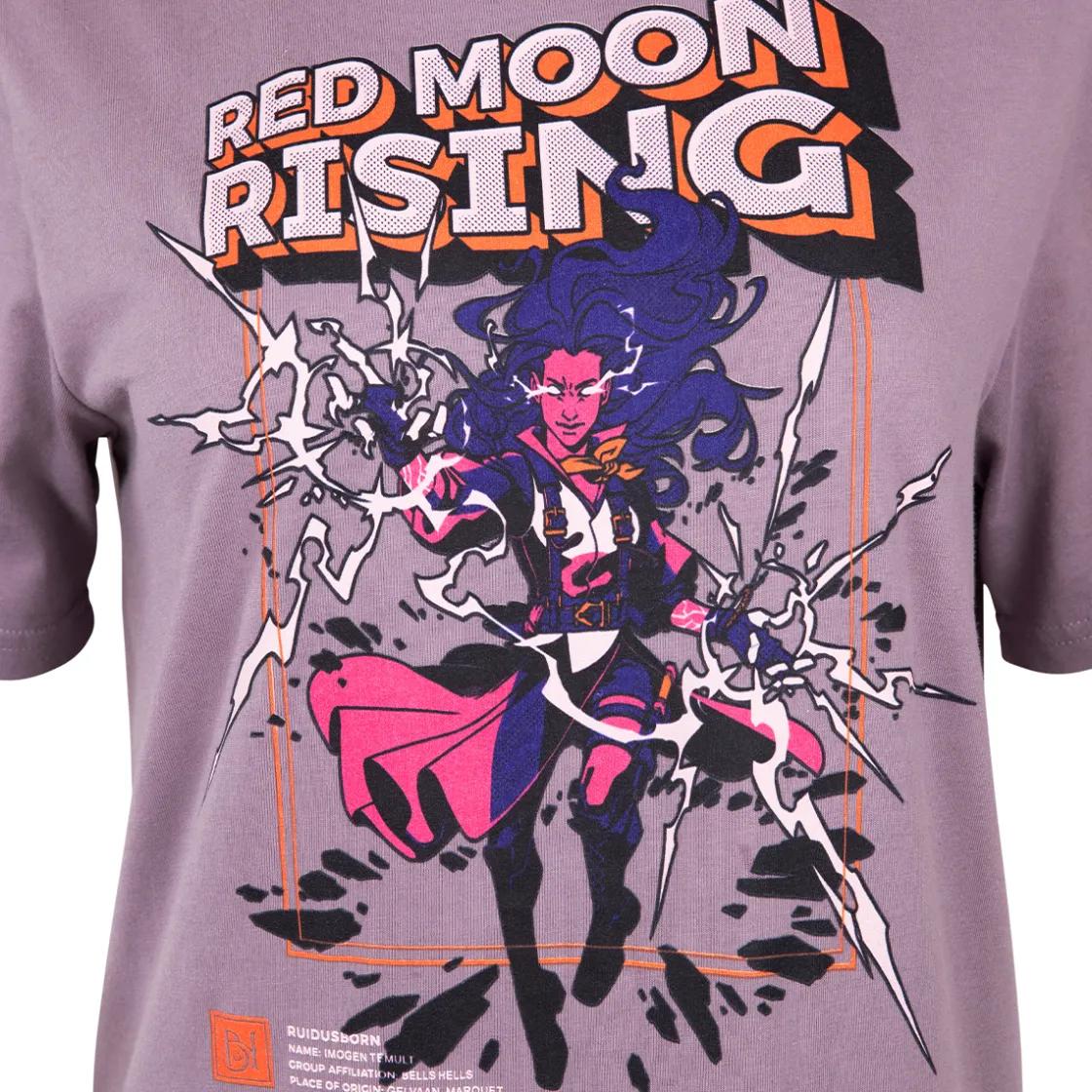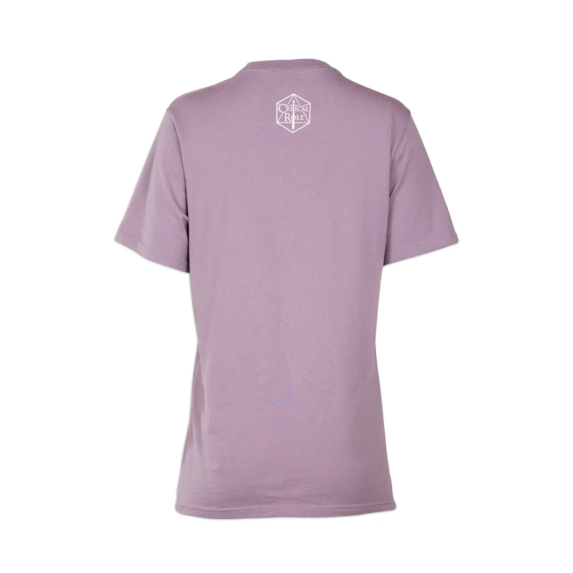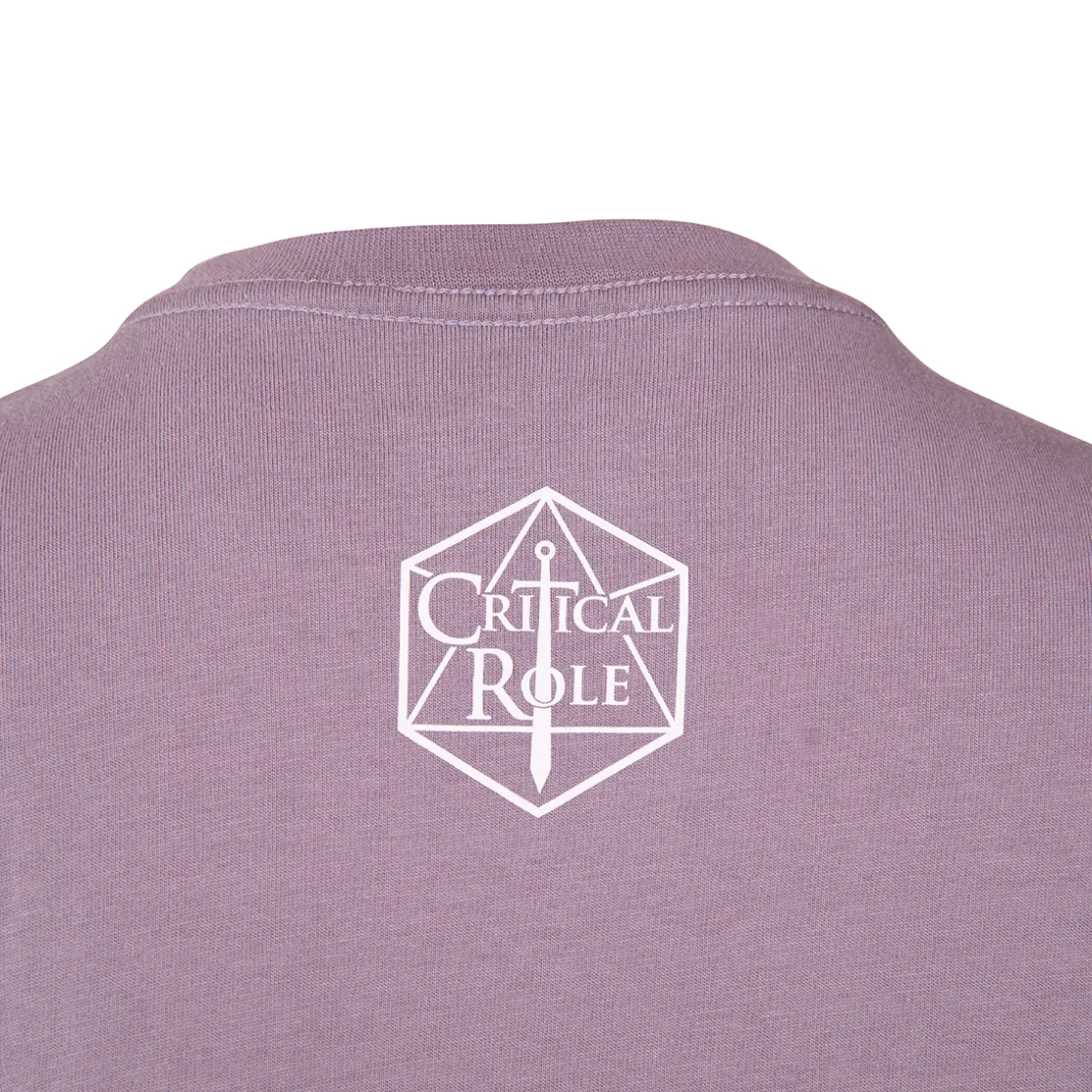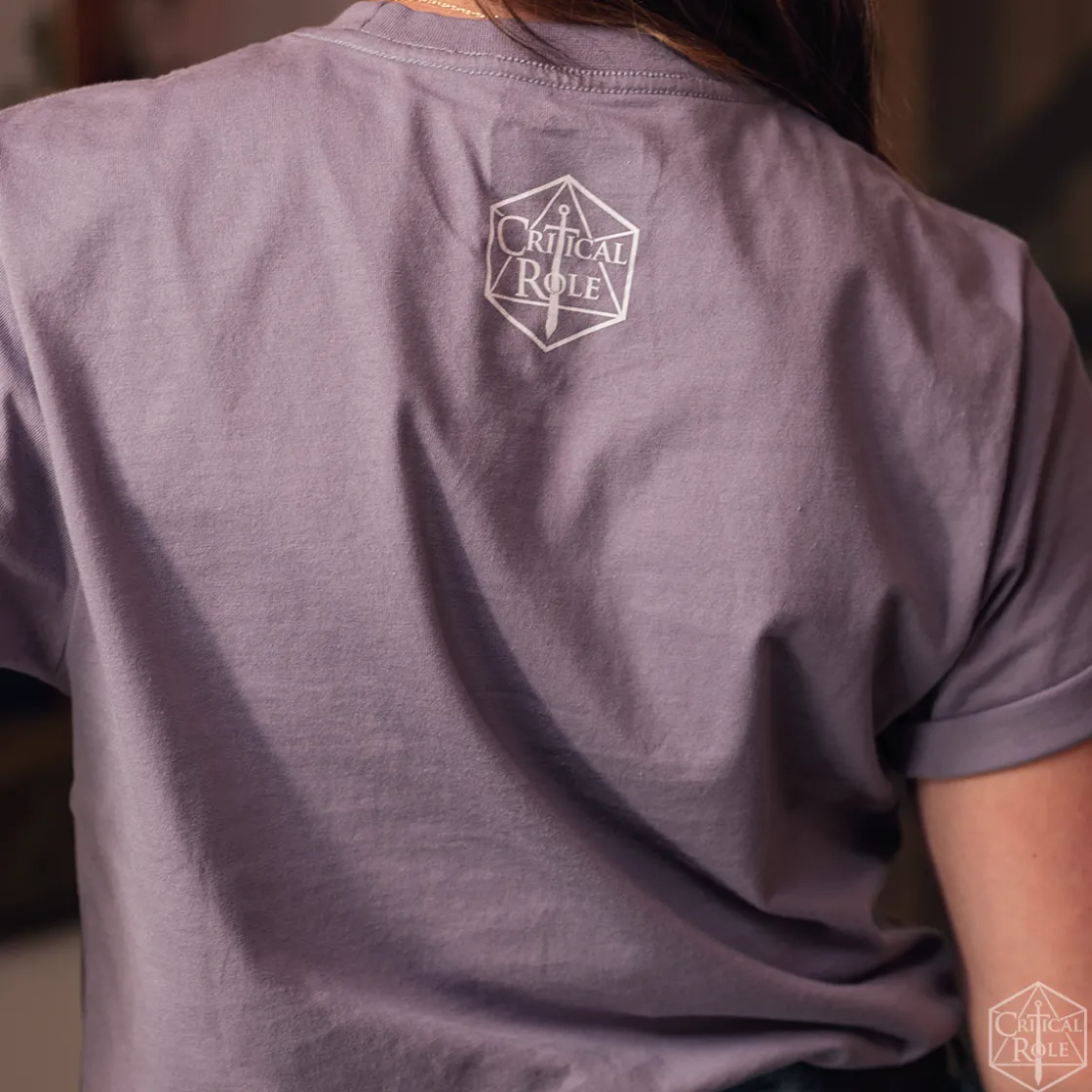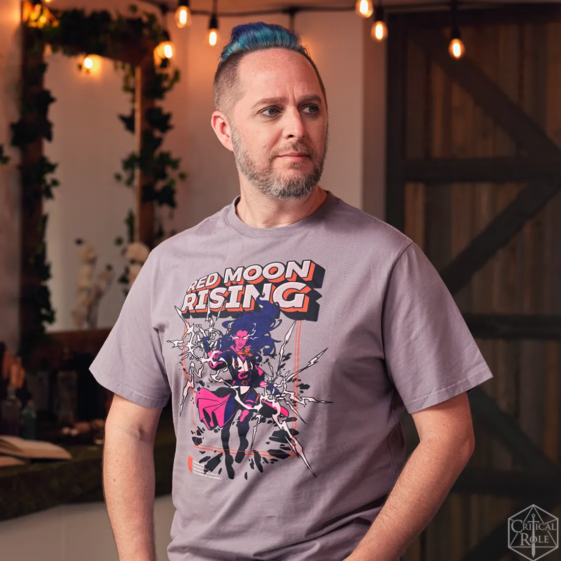 Bearing the title of the 50th episode of Critical Role’s Bells Hells campaign, Red Moon Rising, the Imogen Temult T-Shirt celebrates the powerful sorceress in full comic book superhero fashion! The front of this lavender shirt beautifully illustrates her epic power, floating in midair with white eyes, hair flying, and lightning all around.