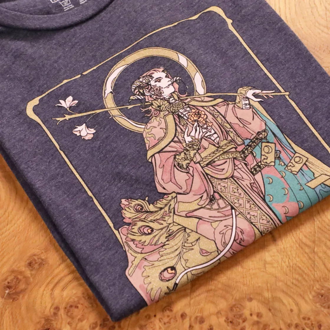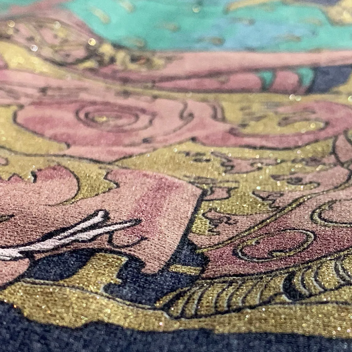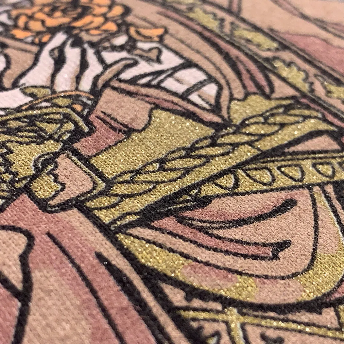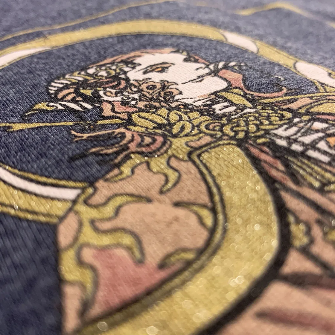 Celebrate the life and legacy of our beloved Mollymauk Tealeaf with this beautiful shirt, featuring tarot-based art of Molly as The Fool. Sparkling glitter covers the gold sections for the appropriate level of flamboyance. Long may he reign, indeed.